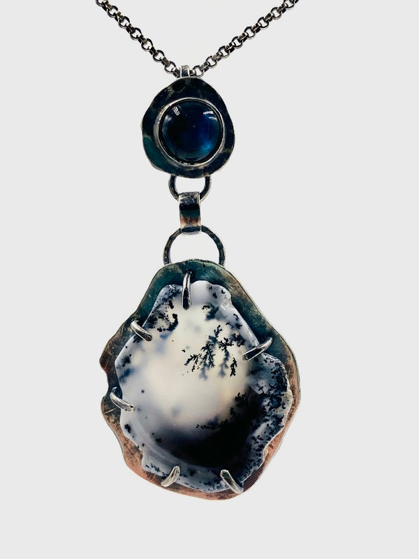This necklace by Lisa Colby is hand wrought with sterling silver and oxidized to highlight the surface texture. The pendant includes a small Labradorite gem stone and a larger Dendritic Opal.