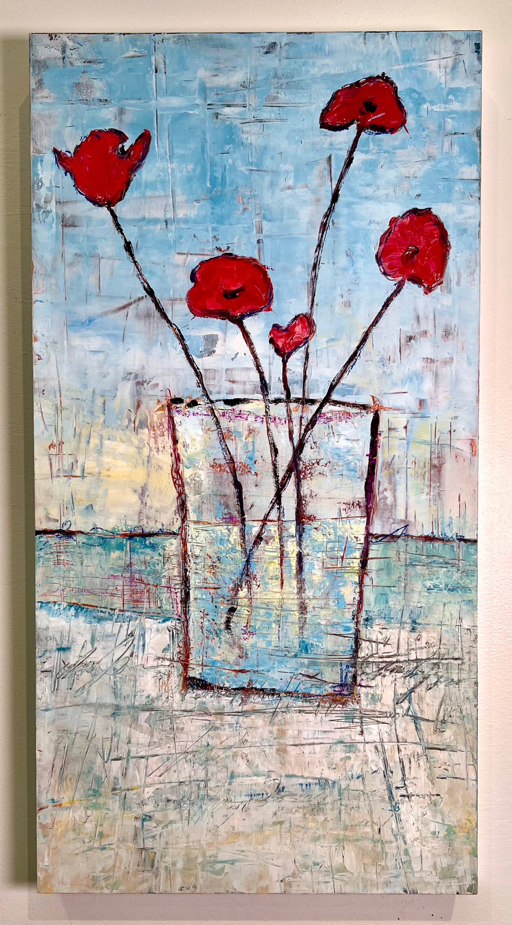 This Oil and Cold Wax painting by Sarkis Chardodjian is 25 x 13 on cradled panel. The edges are silver leafed.