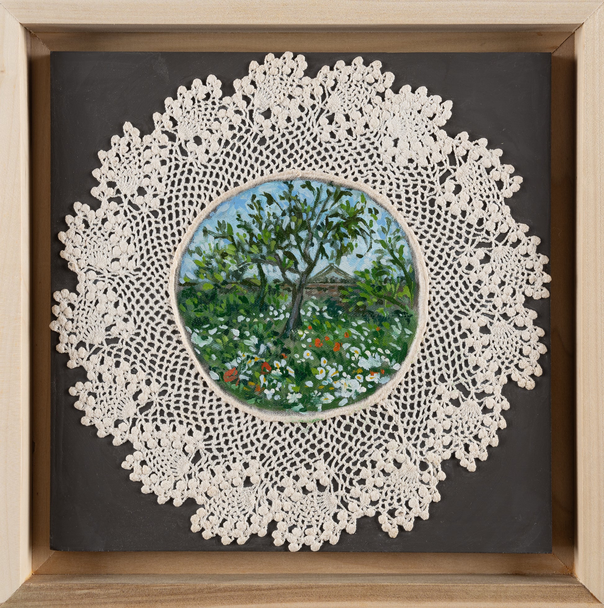 This Mixed Media Painting by Michelle Berg Radford is 10 x 10. This work is painted on a vintage doily.