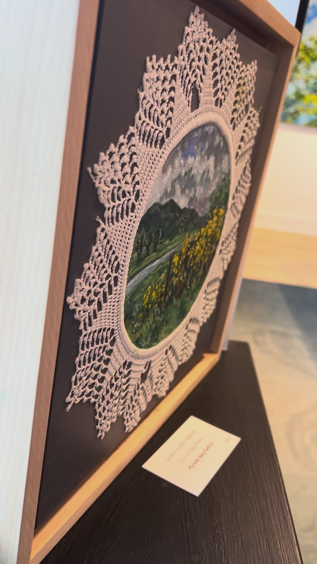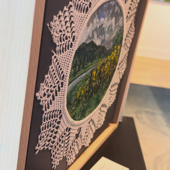 This Mixed Media Painting by Michelle Berg Radford is 12 x 12. This work is painted on a vintage doily.