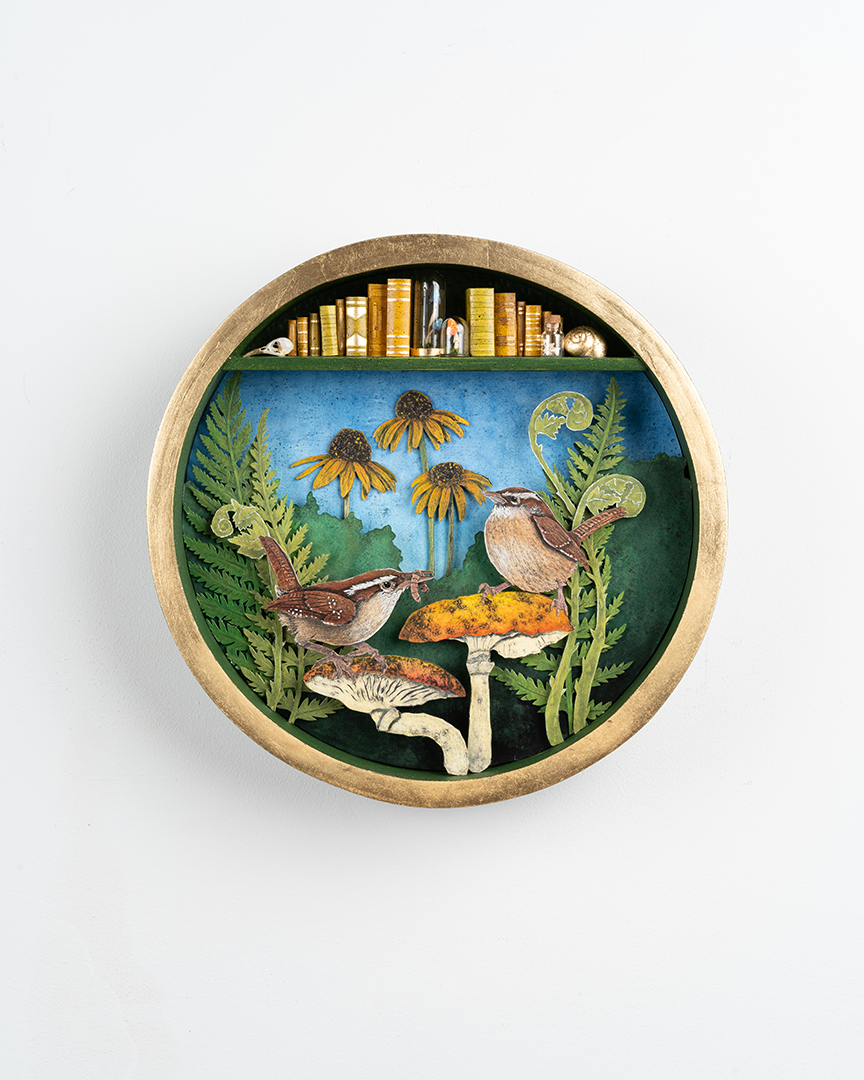 "My work is an exploration of the natural world. I use scraps of wood, paper, bone, and fabric and include both found and crafted specimens. Each art piece contains a variety of processes including collagraph printmaking, woodworking, and sculpting. There is a certain practicality and reflection to my work. I work with things that have died, but left a beautiful reminder of their existence (skulls, vertebrae, fossils, and insects). I am inspired by the sense of discovery of 18th and19th century natural history collections, and the preservation of reliquaries housed in the great cathedrals. As they do, my art invites a closer study of the earth around us." Bess