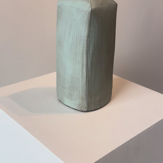 This altered vase by Renata Copeland is sea foam blue with a square shape.