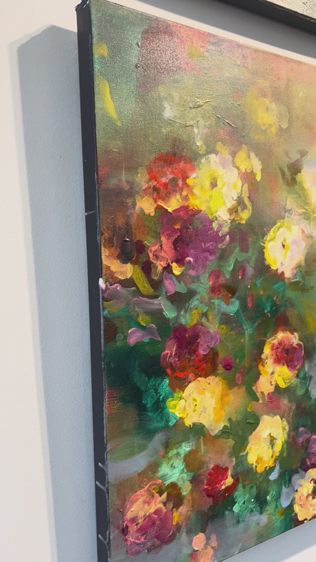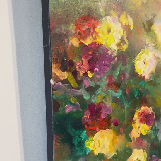 This Oil Painting by Amelia G. DeHart measures 30"x 40". Ameila seeks to express the divine through plant form, she creates complex yet soothing abstracts using vivid pigments and fluid like shapes.