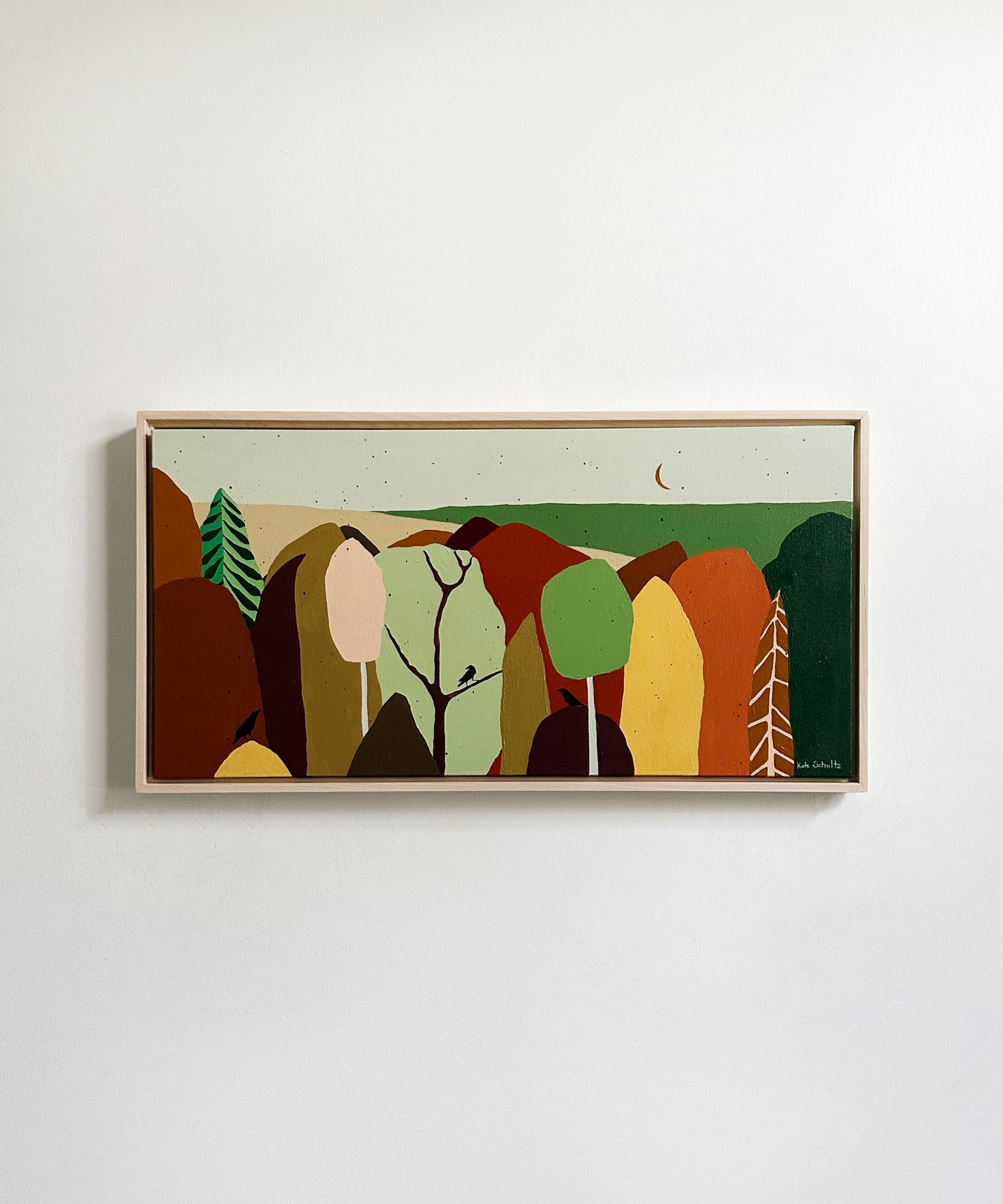 This artwork by Kate Schultz measures 12 x 24. Kate uses acrylic paint on canvas and this work is in a maple floater frame.