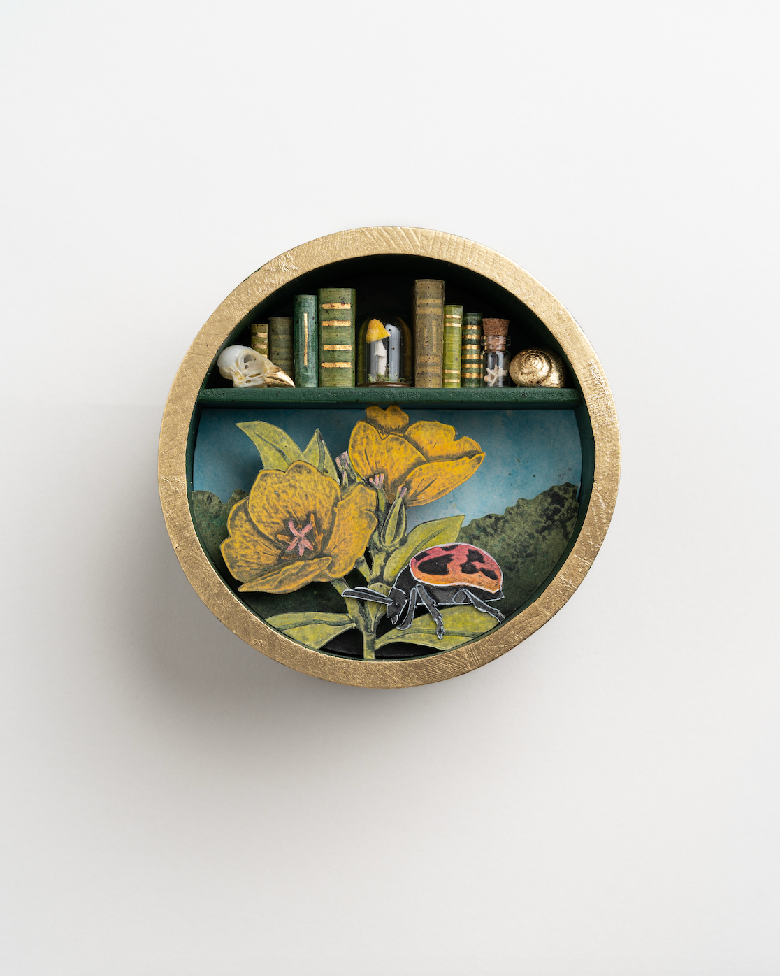 "My work is an exploration of the natural world. I use scraps of wood, paper, bone, and fabric and include both found and crafted specimens. Each art piece contains a variety of processes including collagraph printmaking, woodworking, and sculpting. There is a certain practicality and reflection to my work. I work with things that have died, but left a beautiful reminder of their existence (skulls, vertebrae, fossils, and insects). I am inspired by the sense of discovery of 18th and19th century natural history collections, and the preservation of reliquaries housed in the great cathedrals. As they do, my art invites a closer study of the earth around us." Bess
