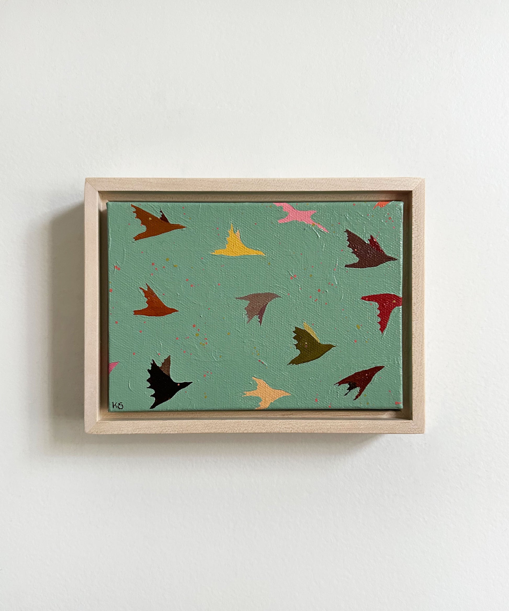 This artwork by Kate Schultz measures 5 x 7. Kate uses acrylic paint on canvas and this work is in a maple floater frame.