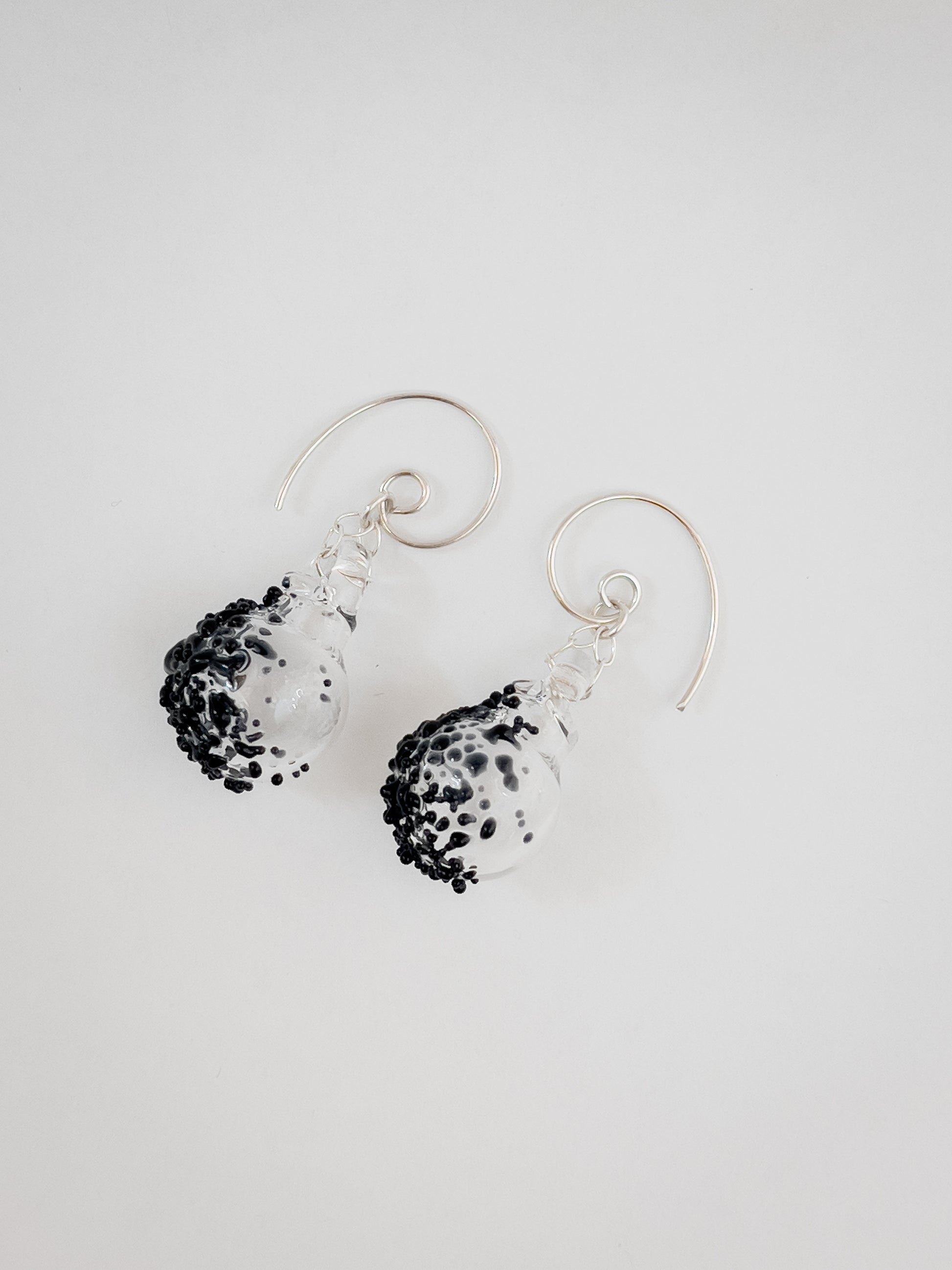 These earrings by Melissa Schmidt feature designer glass handmade bubble beading. The black speckle single drop earrings hang on silver hardware.