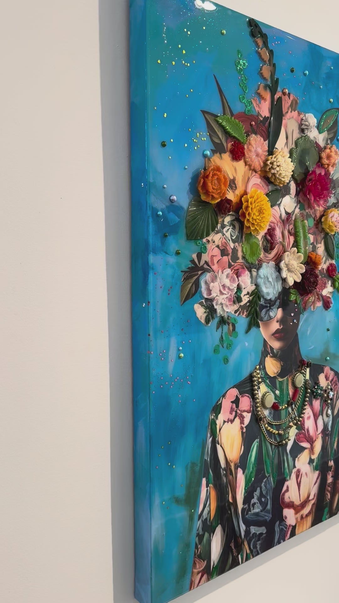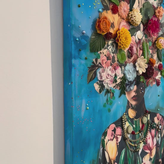 Amy Shekhter is a multi-disciplinary artist living in Florida. She spent the first 20 years of her life growing up in Alaska, which has many months of cold and darkness. This inspired her to use unconventional materials to create a space indoors filled with colorful art and interesting designs. After moving to Florida, she earned her Masters Degree in Art Education, and spent 8 years teaching public and private school students about art. Having missed the time to create her own work, she decided quit teaching to follow her passion and became a full-time artist. Guided by her fascination with different cultures, communities, and fashion, Shekhter merges digital design with various materials and textures. Layers of media, such as resin castings, plexiglass, beads and glass are carefully placed to give each artwork a three-dimensional appearance. Each figure is imagined from a distant memory or dream and inspired by the beauty of nature and growth, giving the viewer a sense of joy and wonder while also having them construct their own connection from the various visual elements.