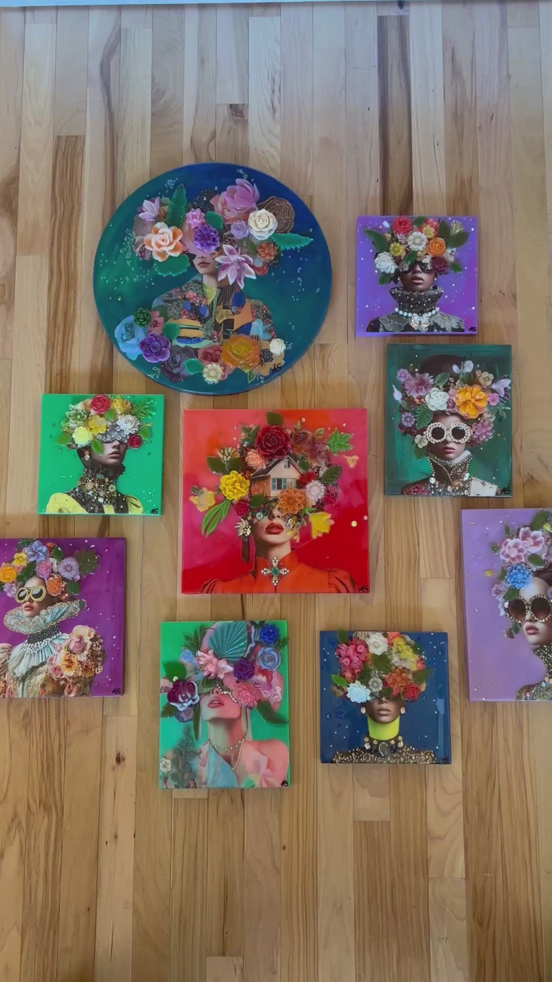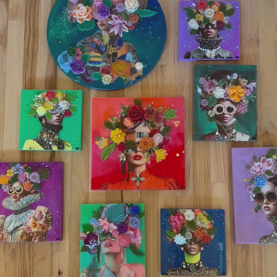 Amy Shekhter is a multi-disciplinary artist living in Florida. She spent the first 20 years of her life growing up in Alaska, which has many months of cold and darkness. This inspired her to use unconventional materials to create a space indoors filled with colorful art and interesting designs. After moving to Florida, she earned her Masters Degree in Art Education, and spent 8 years teaching public and private school students about art. Having missed the time to create her own work, she decided quit teaching to follow her passion and became a full-time artist. Guided by her fascination with different cultures, communities, and fashion, Shekhter merges digital design with various materials and textures. Layers of media, such as resin castings, plexiglass, beads and glass are carefully placed to give each artwork a three-dimensional appearance. Each figure is imagined from a distant memory or dream and inspired by the beauty of nature and growth, giving the viewer a sense of joy and wonder while also having them construct their own connection from the various visual elements.