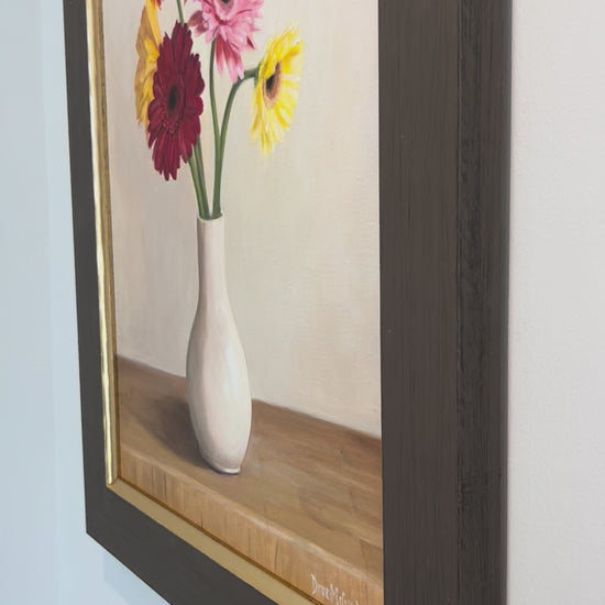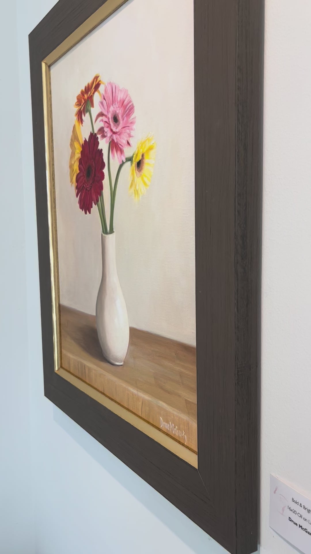 This oil on linen painting by Drue McGarty measures 16"x 20". This painting is set in a wood and gold frame.