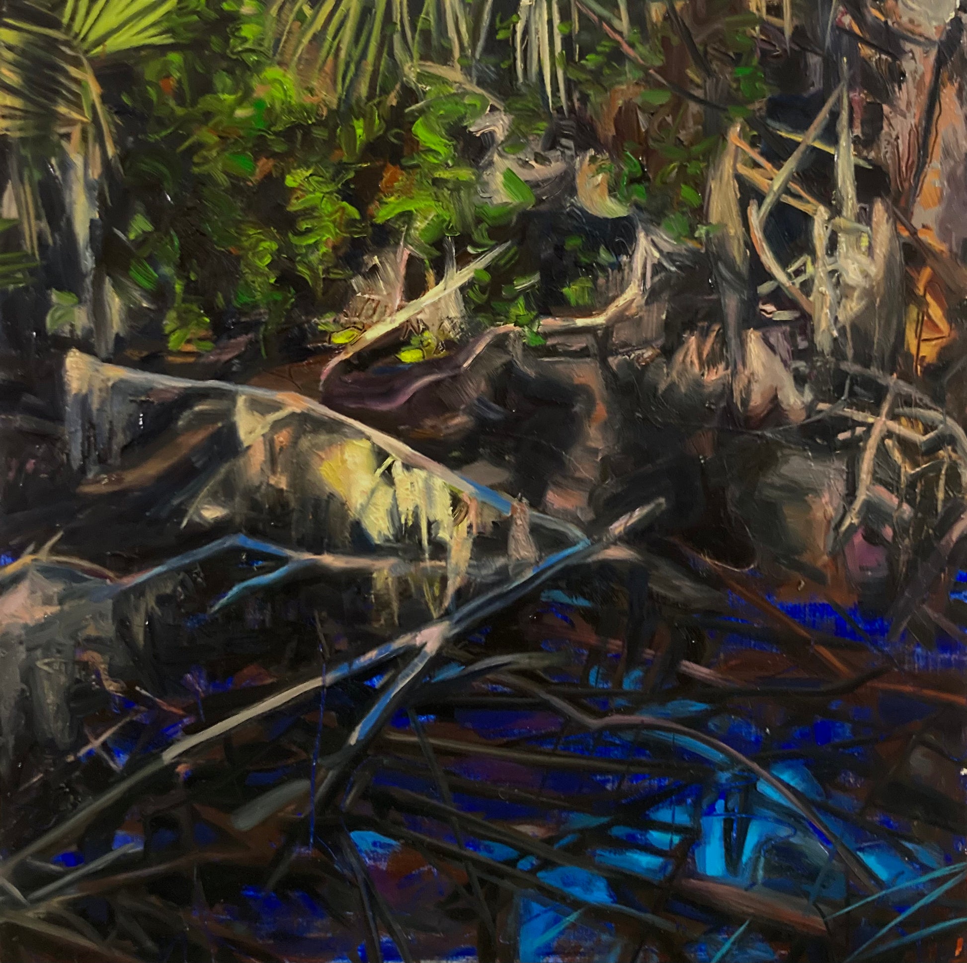 This 10 x 10 oil on panel painting by Laura Colomb features a vivid, layered brushstroke style that merges abstract shapes with rich, natural hues. Energetic swirls of pigment create depth and movement, capturing the lush essence of foliage and undergrowth.