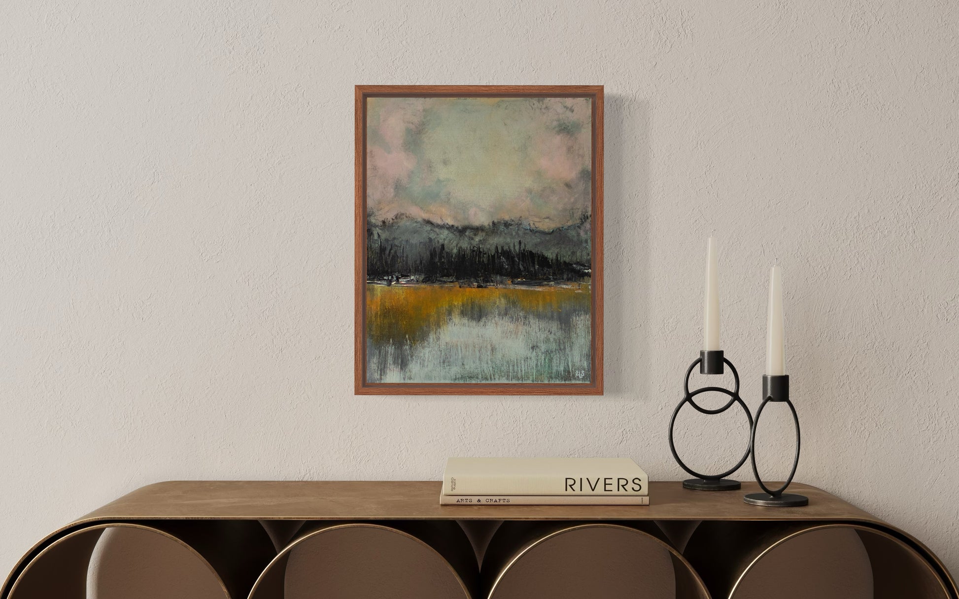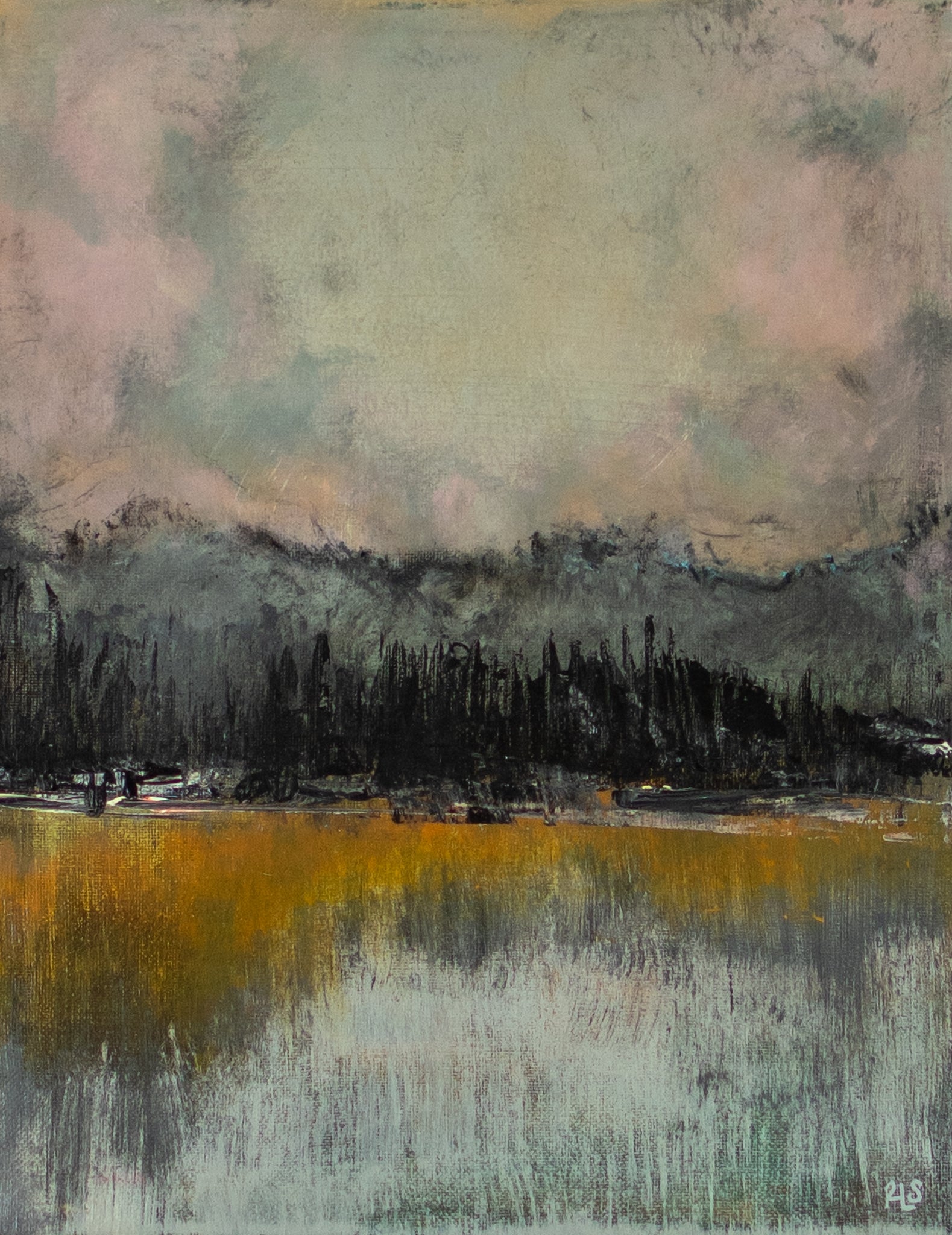 This work by Becca Splawn is 11 x 14 and is in a floater frame. Becca's work is crafted using acrylic and mixed media on canvas. Her works are inspired by the expansive landscapes of rural South Carolina and Northern Michigan, where she spent most of her childhood.