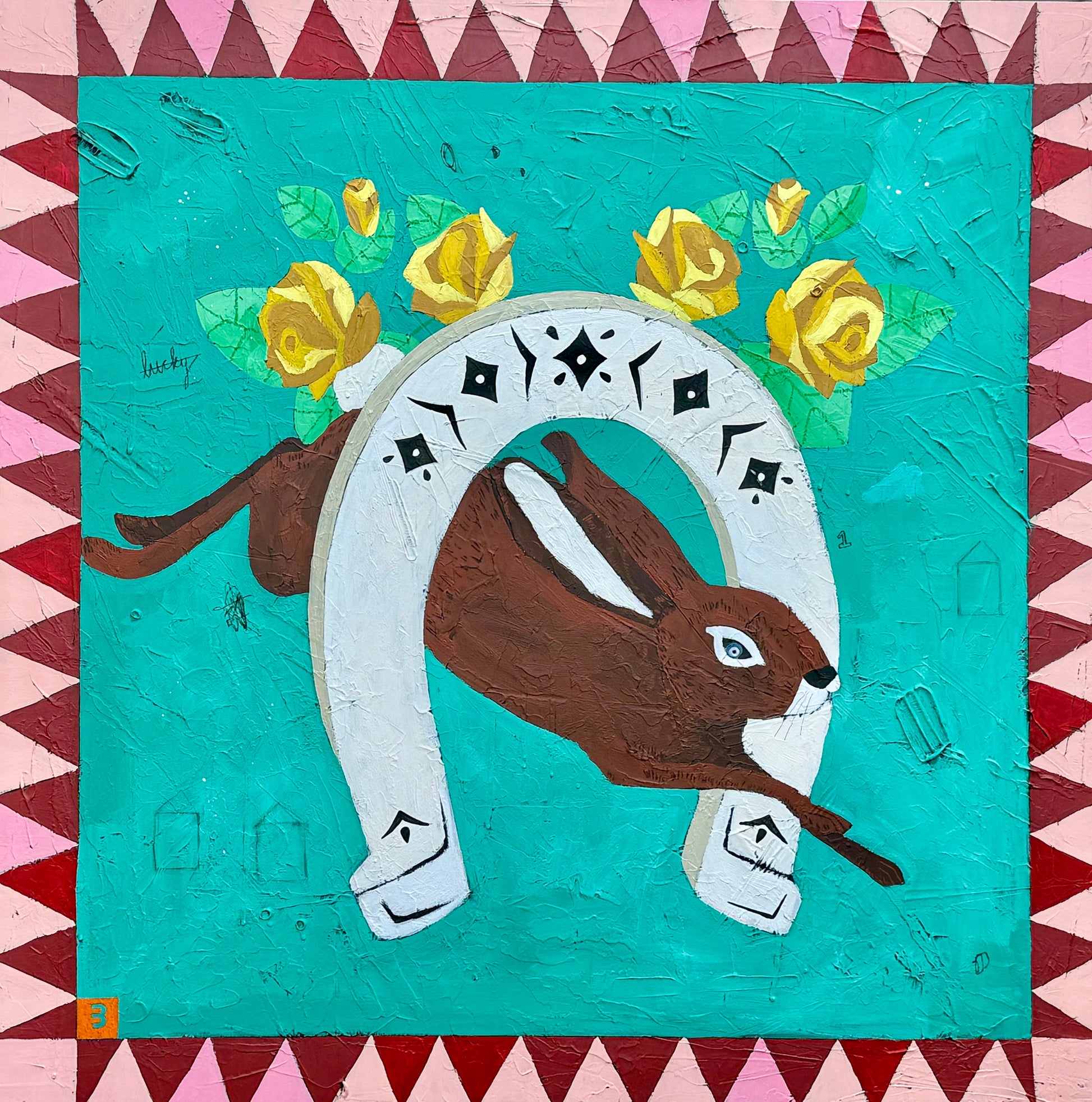 This painting by Bennett measures 36 x36. Bennett's mixed media paintings are a celebration of all-things mid-century advertising, pop-art, and her southern upbringing.