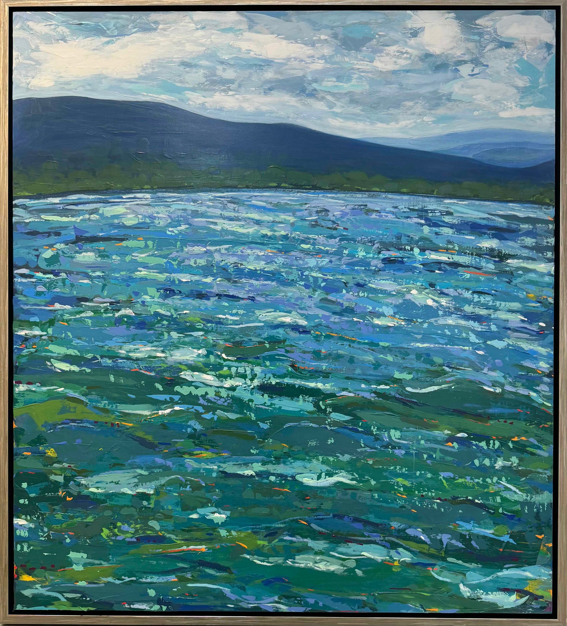 This Painting by Moni Hill is 36 x 40. Moni Hill is inspired by the natural world and uses acrylic paint layered upon wood in her work. This collection is a celebration of resilience and beauty of the mountain lakes of the southeast region.