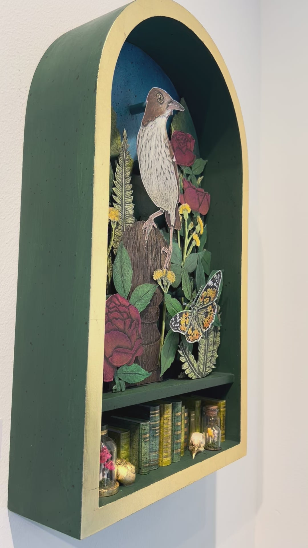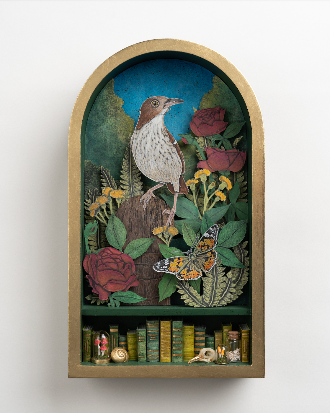 "My work is an exploration of the natural world. I use scraps of wood, paper, bone, and fabric and include both found and crafted specimens. Each art piece contains a variety of processes including collagraph printmaking, woodworking, and sculpting. There is a certain practicality and reflection to my work. I work with things that have died, but left a beautiful reminder of their existence (skulls, vertebrae, fossils, and insects). I am inspired by the sense of discovery of 18th and19th century natural history collections, and the preservation of reliquaries housed in the great cathedrals. As they do, my art invites a closer study of the earth around us." Bess