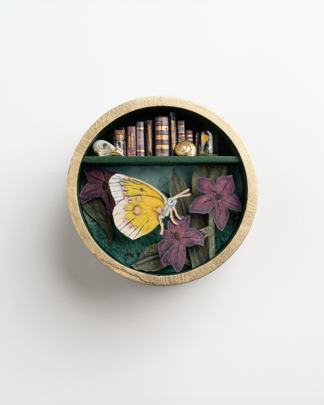 "My work is an exploration of the natural world. I use scraps of wood, paper, bone, and fabric and include both found and crafted specimens. Each art piece contains a variety of processes including collagraph printmaking, woodworking, and sculpting. There is a certain practicality and reflection to my work. I work with things that have died, but left a beautiful reminder of their existence (skulls, vertebrae, fossils, and insects). I am inspired by the sense of discovery of 18th and19th century natural history collections, and the preservation of reliquaries housed in the great cathedrals. As they do, my art invites a closer study of the earth around us." Bess