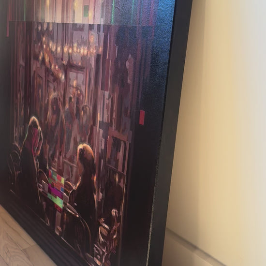 This acrylic painting by Esther Moorehead is 36 x 36. Esther is inspired by her travels around the world to create her bold figurative paintings on canvas.
