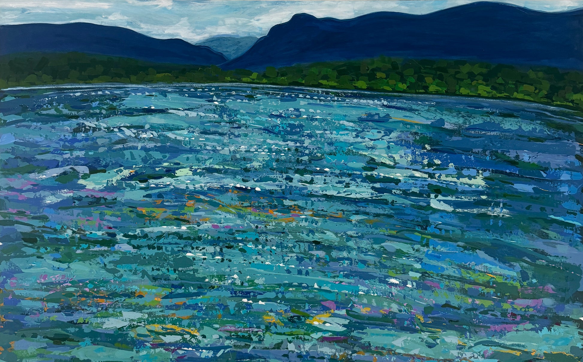 This Painting by Moni Hill is 48 x 30. Moni Hill is inspired by the natural world and uses acrylic paint layered upon wood in her work. This collection is a celebration of resilience and beauty of the mountain lakes of the southeast region.