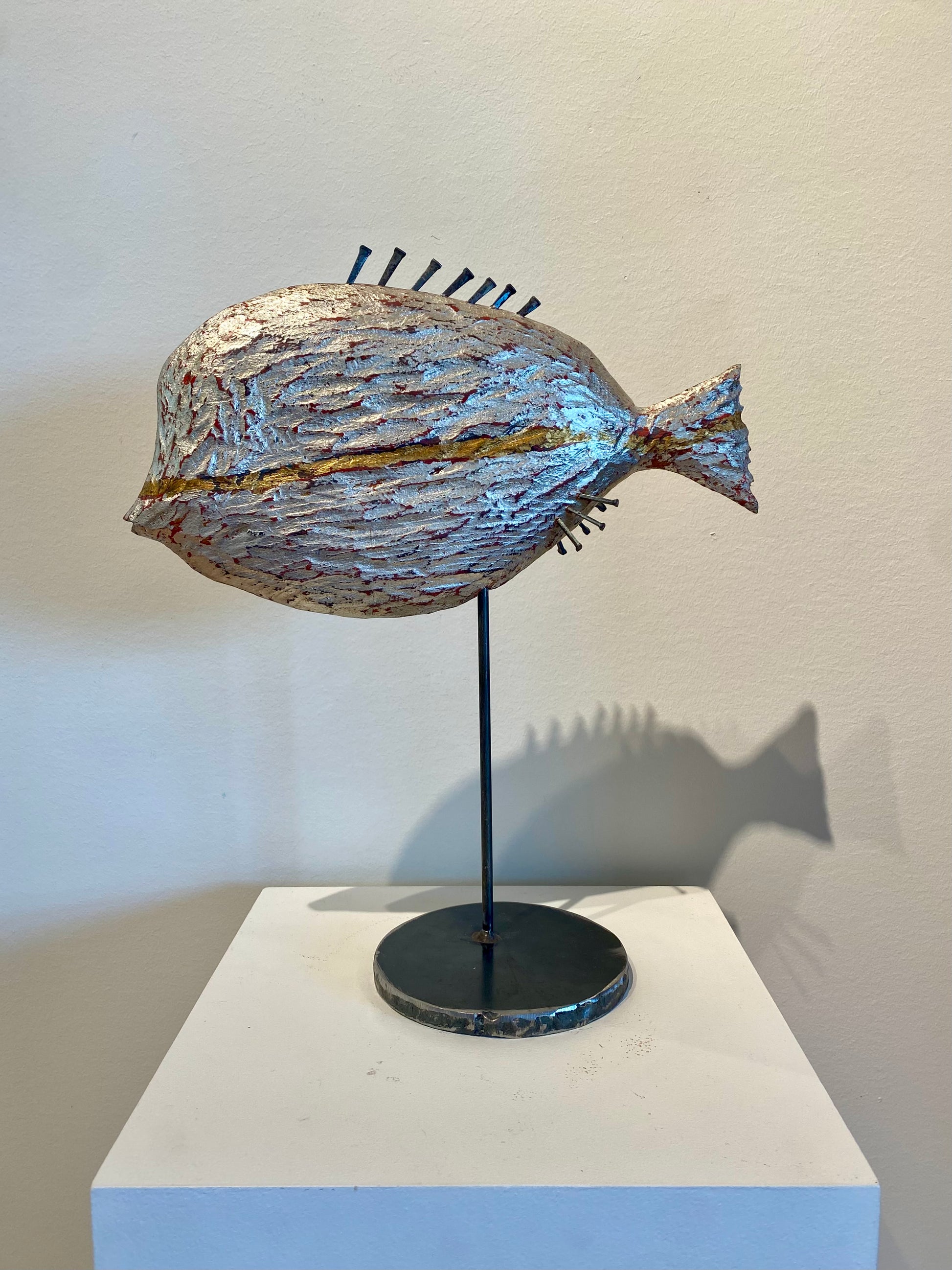 This handmade fish sculpture by Sarkis Chorbadjian is made of wood and silver leaf plating on the surface.