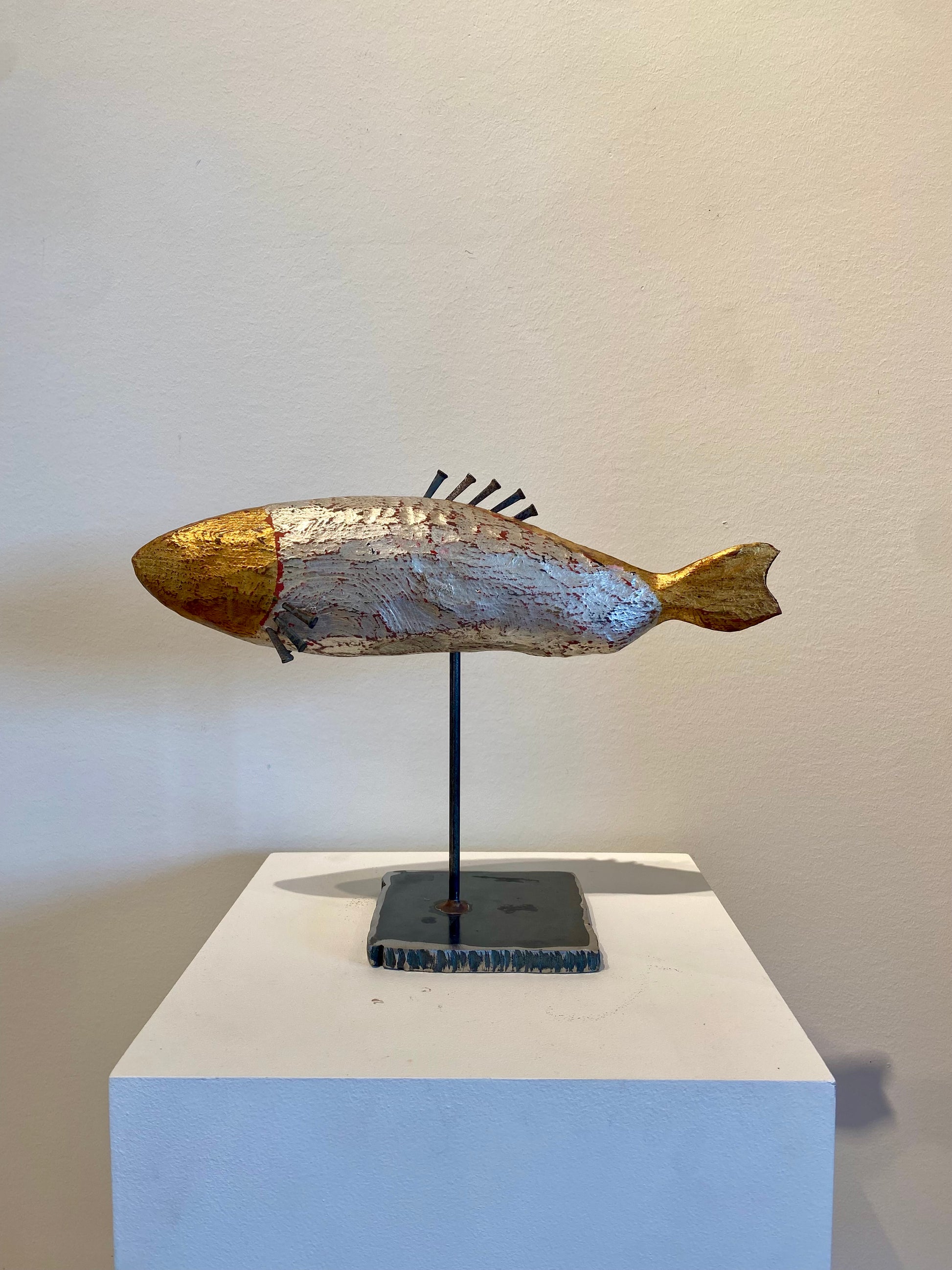 This handmade fish sculpture by Sarkis Chorbadjian is made of wood and silver leaf plating on the surface.
