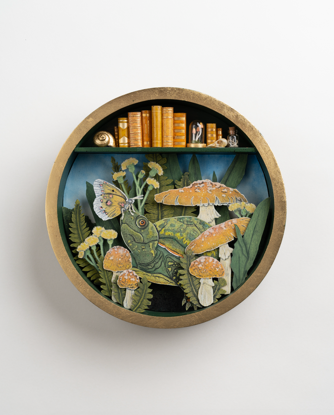 "My work is an exploration of the natural world. I use scraps of wood, paper, bone, and fabric and include both found and crafted specimens. Each art piece contains a variety of processes including collagraph printmaking, woodworking, and sculpting. There is a certain practicality and reflection to my work. I work with things that have died, but left a beautiful reminder of their existence (skulls, vertebrae, fossils, and insects). I am inspired by the sense of discovery of 18th and19th century natural history collections, and the preservation of reliquaries housed in the great cathedrals. As they do, my art invites a closer study of the earth around us." Bess