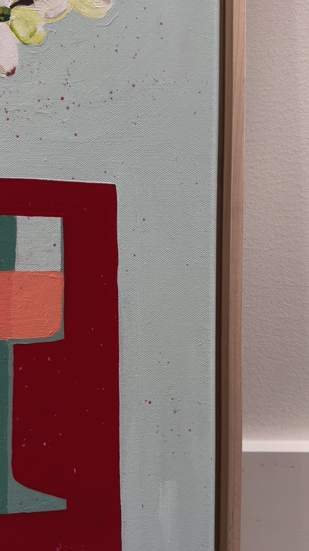 This artwork by Kate Schultz measures 24 x 30. Kate uses acrylic paint on canvas and this work is in a maple floater frame.