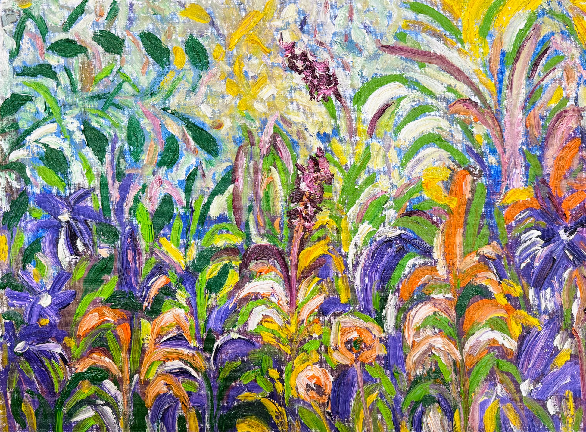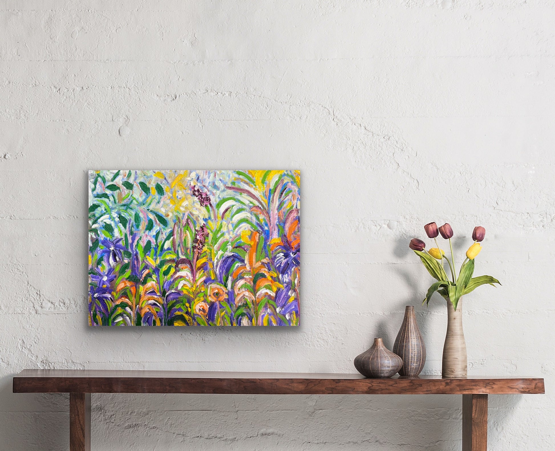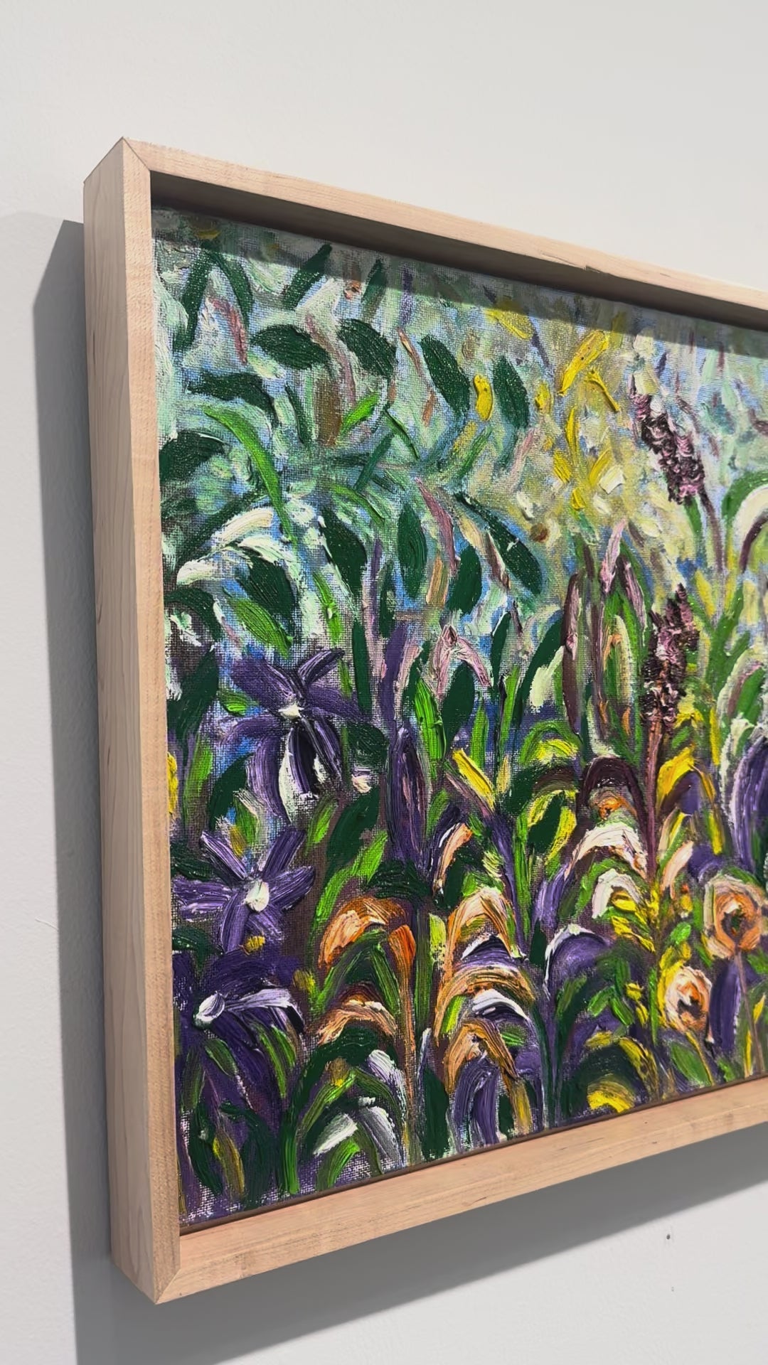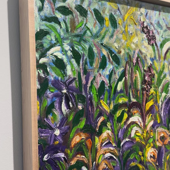 This mixed media painting by Pavni measures 12"x 16", and is in a natural wood framed. Her work depicts dense garden foliage using loose brushwork and a vibrant palette of greens, blues, purples, and warm earth tones.
