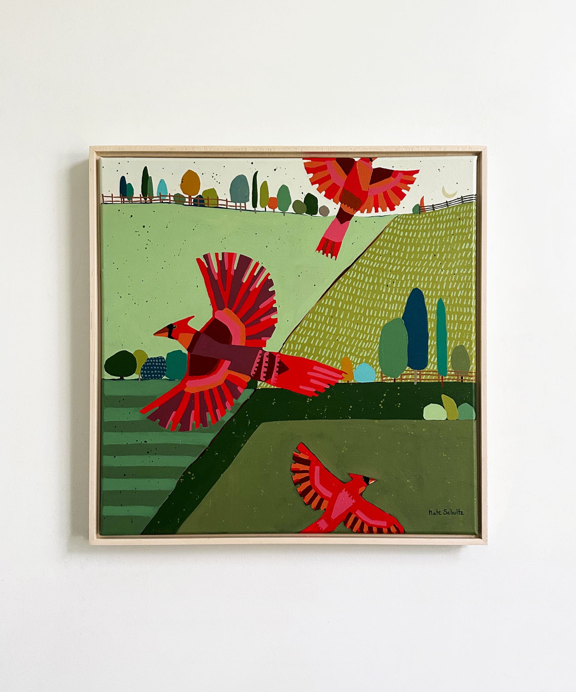 This artwork by Kate Schultz measures 20 x 20. Kate uses acrylic paint on canvas and this work is in a maple floater frame.