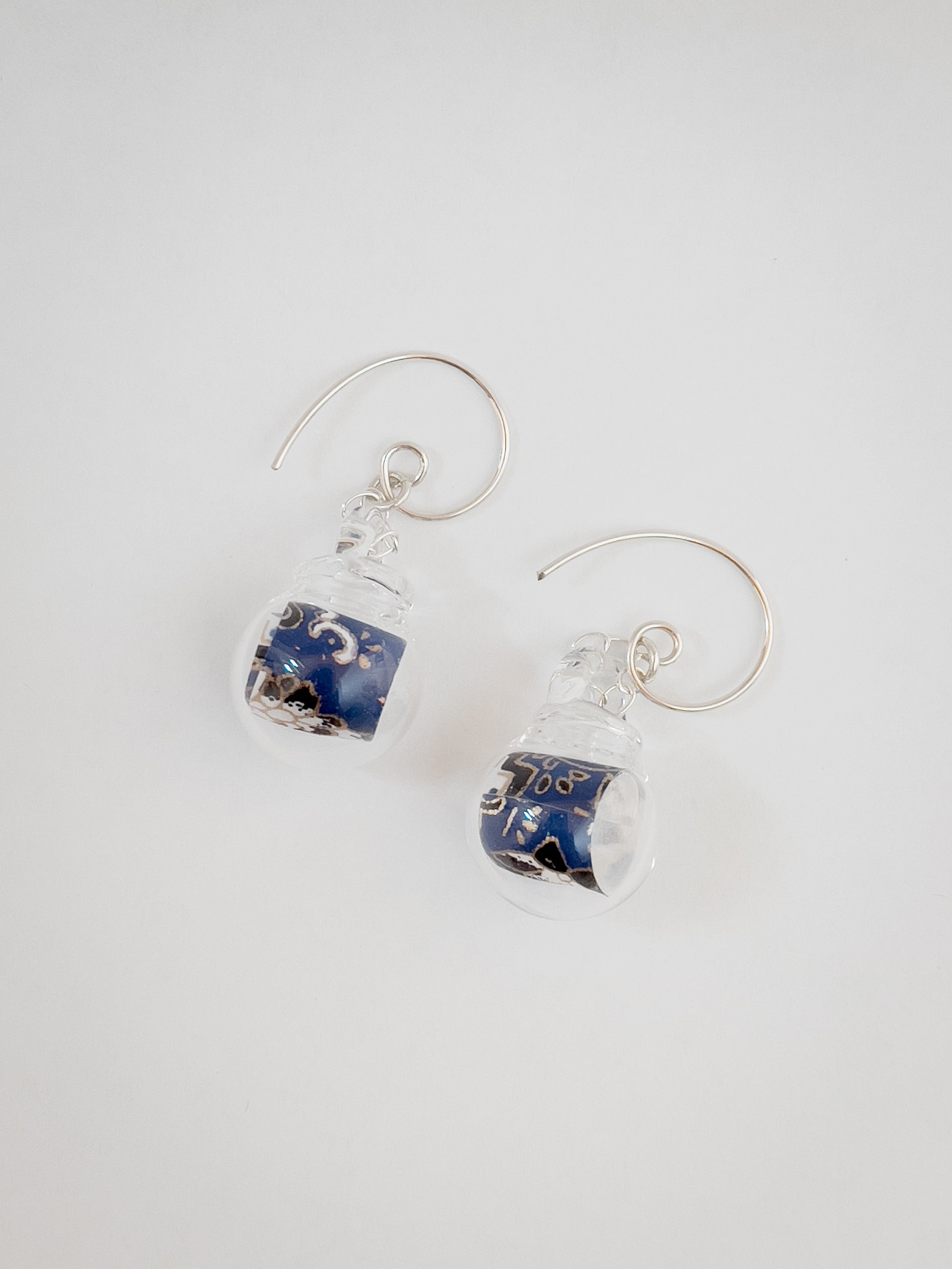 These earrings by Melissa Schmidt feature designer glass handmade bubble beading. The blue origami scroll earrings hang on silver hardware.