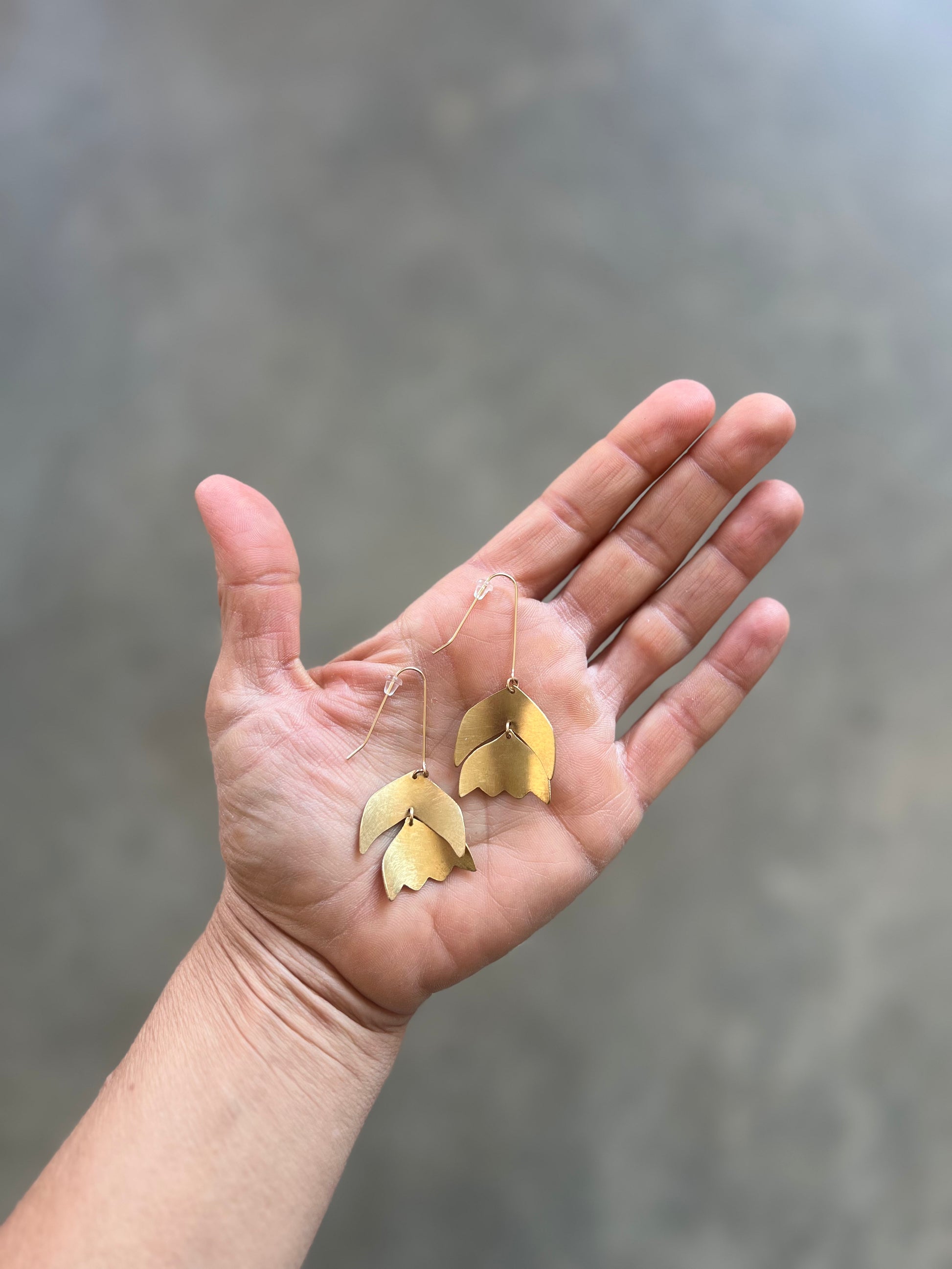 These Golden Tulip Earrings are made with mixed metals and have 14 karat gold fill ear wires. Soft gold color enhances these one of a kind earrings. Wire is hand formed and forged with various hammers. Pieces are hand sanded, polished, and tumbled for shine. All of her work is created in her home studio.