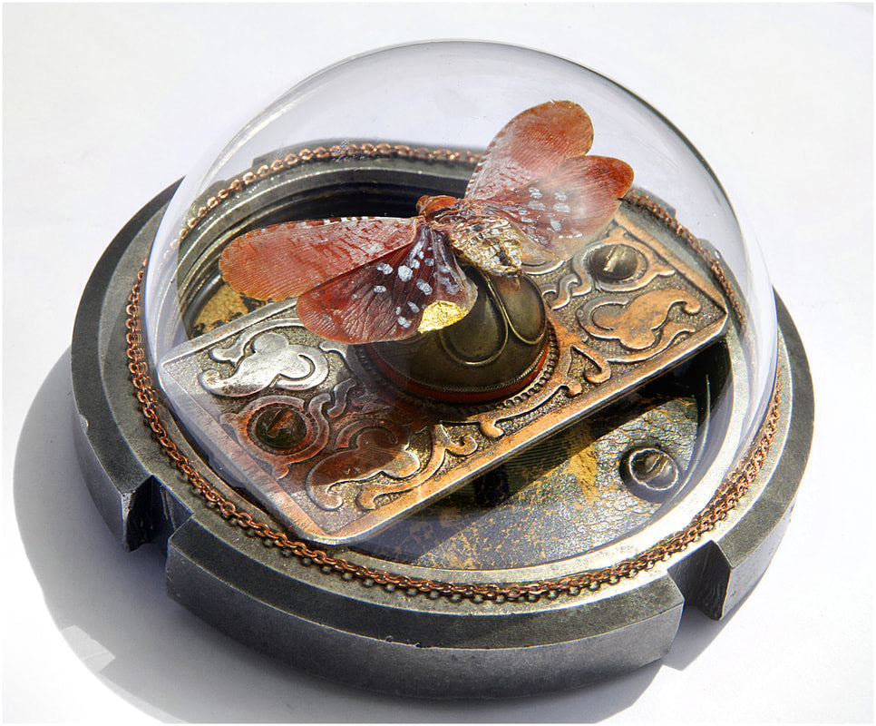 Suzanne Schmid’s pieces are preserved under a glass dome that she hand-blows in a hot glass studio. She uses a "cold connection" technique to build her pieces with nuts and bolts and machining parts. Her sculptures are modern-day reliquaries for the office and home.