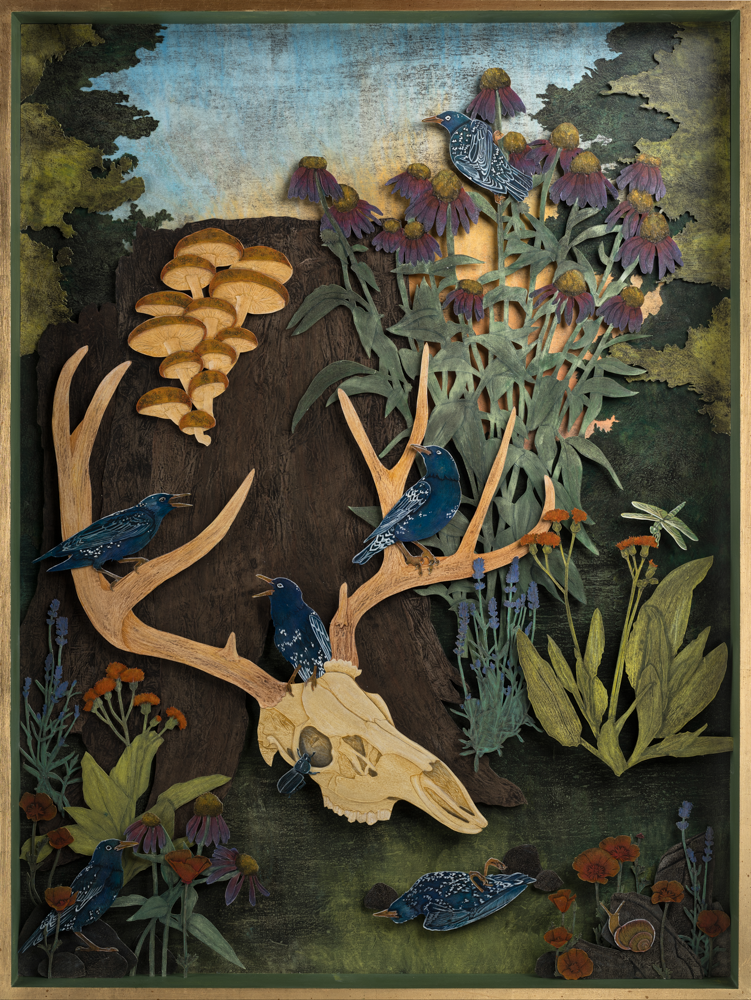 "My work is an exploration of the natural world. I use scraps of wood, paper, bone, and fabric and include both found and crafted specimens. Each art piece contains a variety of processes including collagraph printmaking, woodworking, and sculpting. There is a certain practicality and reflection to my work. I work with things that have died, but left a beautiful reminder of their existence (skulls, vertebrae, fossils, and insects). I am inspired by the sense of discovery of 18th and19th century natural history collections, and the preservation of reliquaries housed in the great cathedrals. As they do, my art invites a closer study of the earth around us." Bess