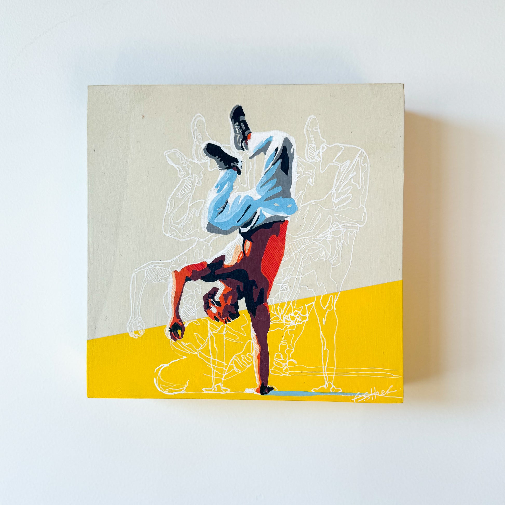 This acrylic painting by Esther Moorehead is 8 x 8. Esther is inspired by her travels around the world to create her bold figurative paintings on canvas.