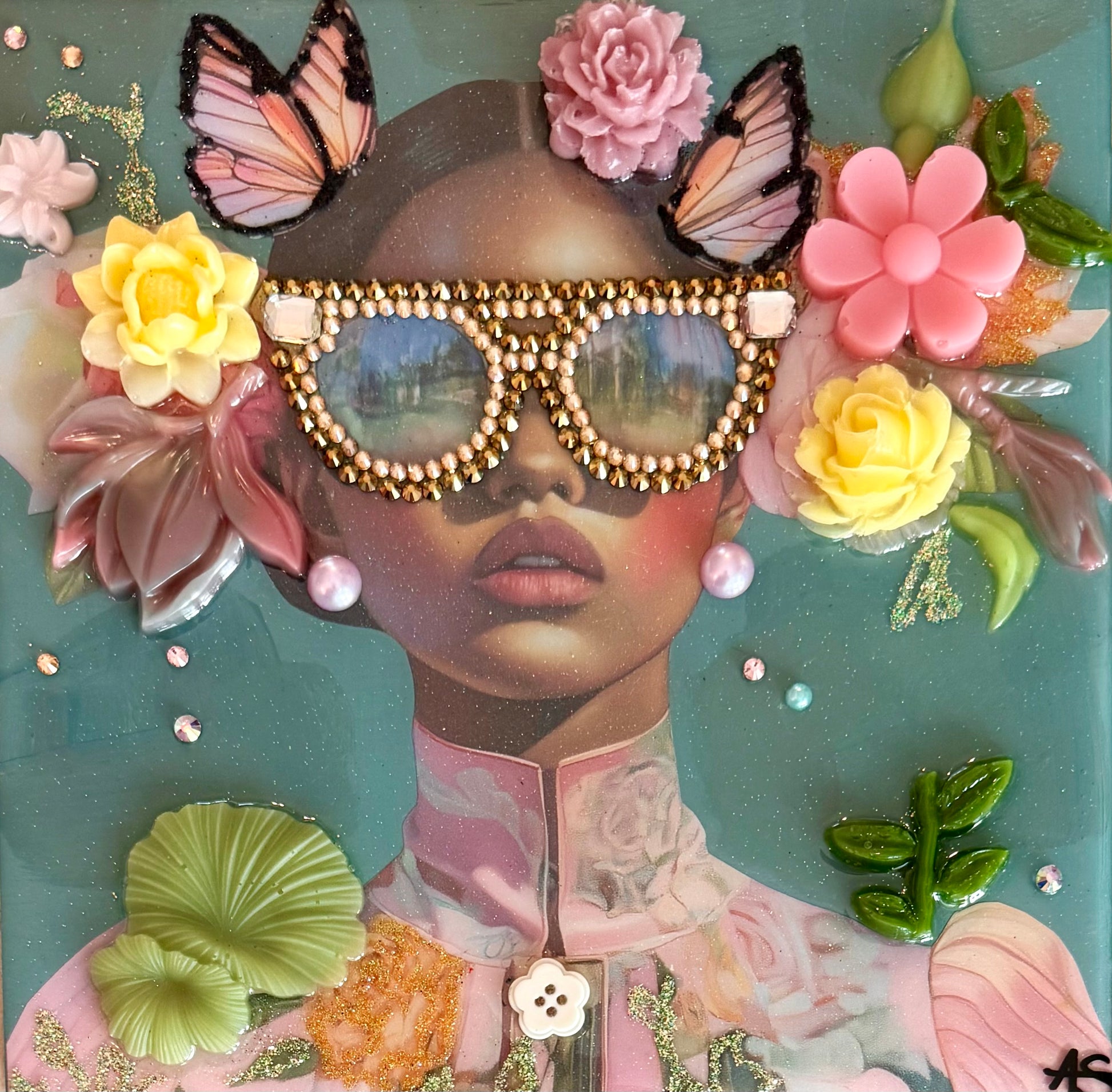 This artwork by Amy Shekhter measures 8" x 8". Amy merges digital design with layers of texture including: resin, glitter, paint, and crystals.