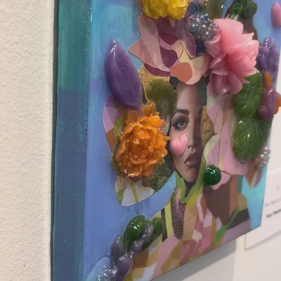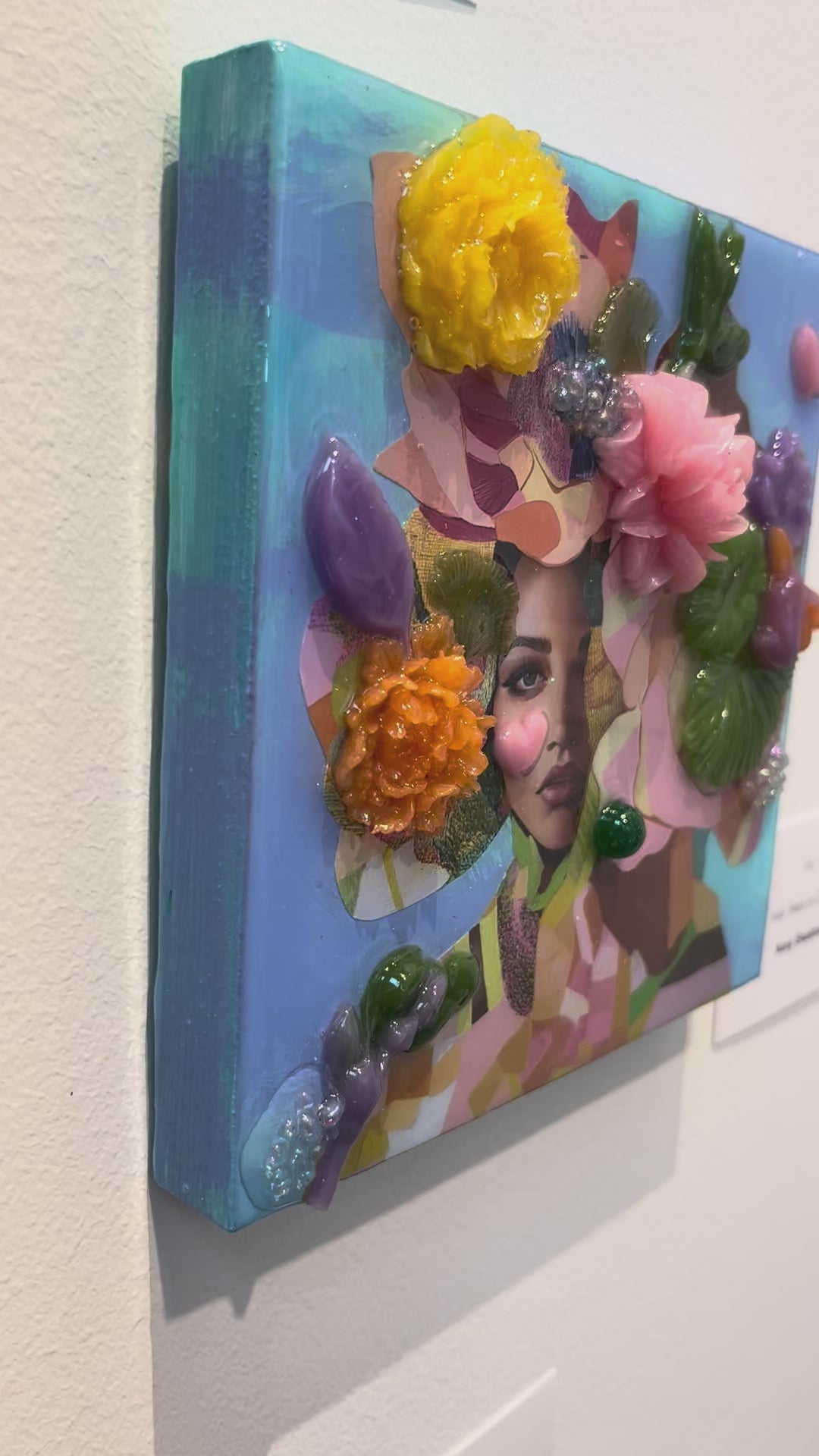 This artwork by Amy Shekhter measures 6" x 6". Amy merges digital design with layers of texture including: resin, glitter, paint, and crystals.