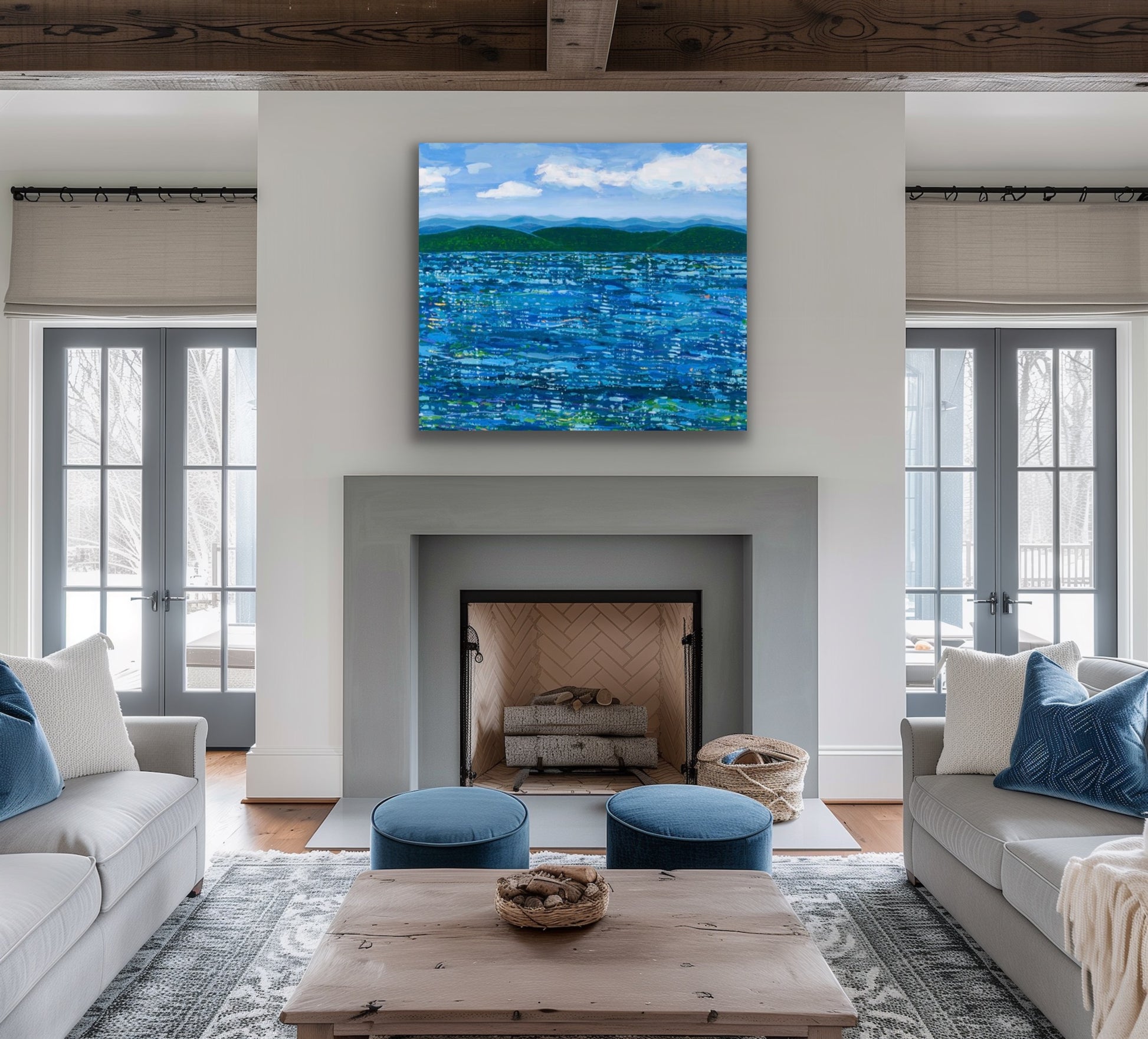 This Painting by Moni Hill is 48 x 40. Moni Hill is inspired by the natural world and uses acrylic paint layered upon wood in her work. This collection is a celebration of resilience and beauty of the mountain lakes of the southeast region.