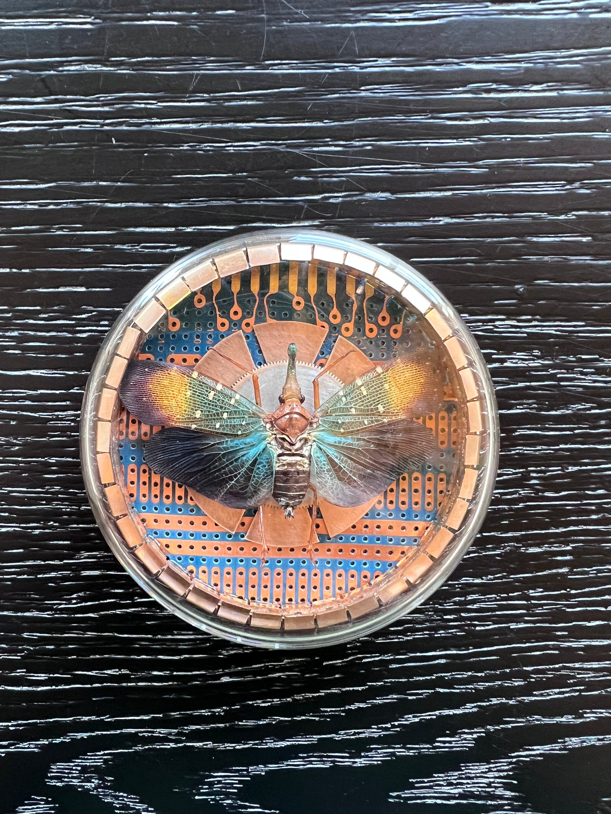 Suzanne Schmid’s pieces are preserved under a glass dome that she hand-blows in a hot glass studio. She uses a "cold connection" technique to build her pieces with nuts and bolts and machining parts. Her sculptures are modern-day reliquaries for the office and home.