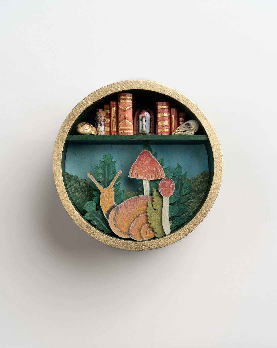 "My work is an exploration of the natural world. I use scraps of wood, paper, bone, and fabric and include both found and crafted specimens. Each art piece contains a variety of processes including collagraph printmaking, woodworking, and sculpting. There is a certain practicality and reflection to my work. I work with things that have died, but left a beautiful reminder of their existence (skulls, vertebrae, fossils, and insects). I am inspired by the sense of discovery of 18th and19th century natural history collections, and the preservation of reliquaries housed in the great cathedrals. As they do, my art invites a closer study of the earth around us." Bess