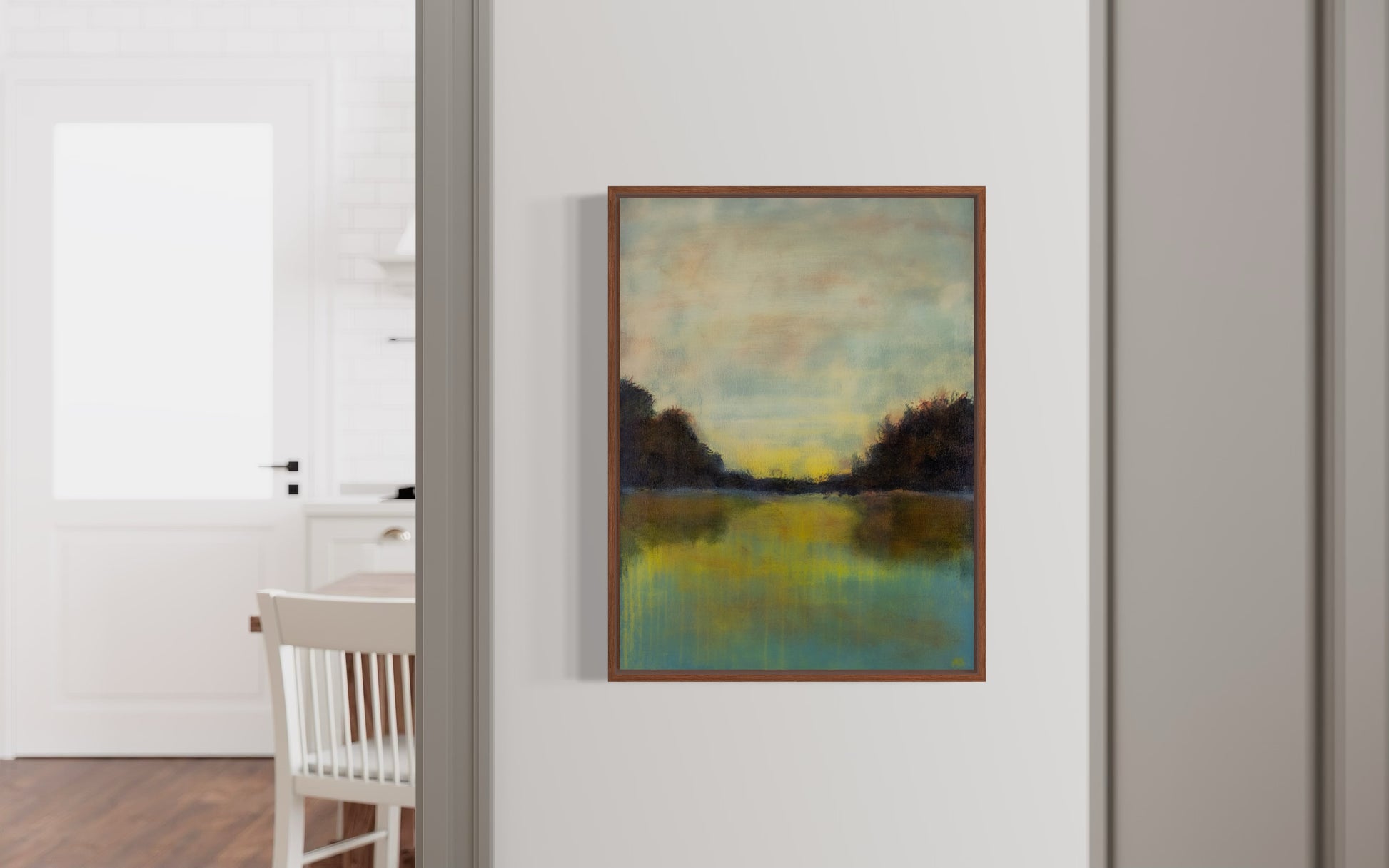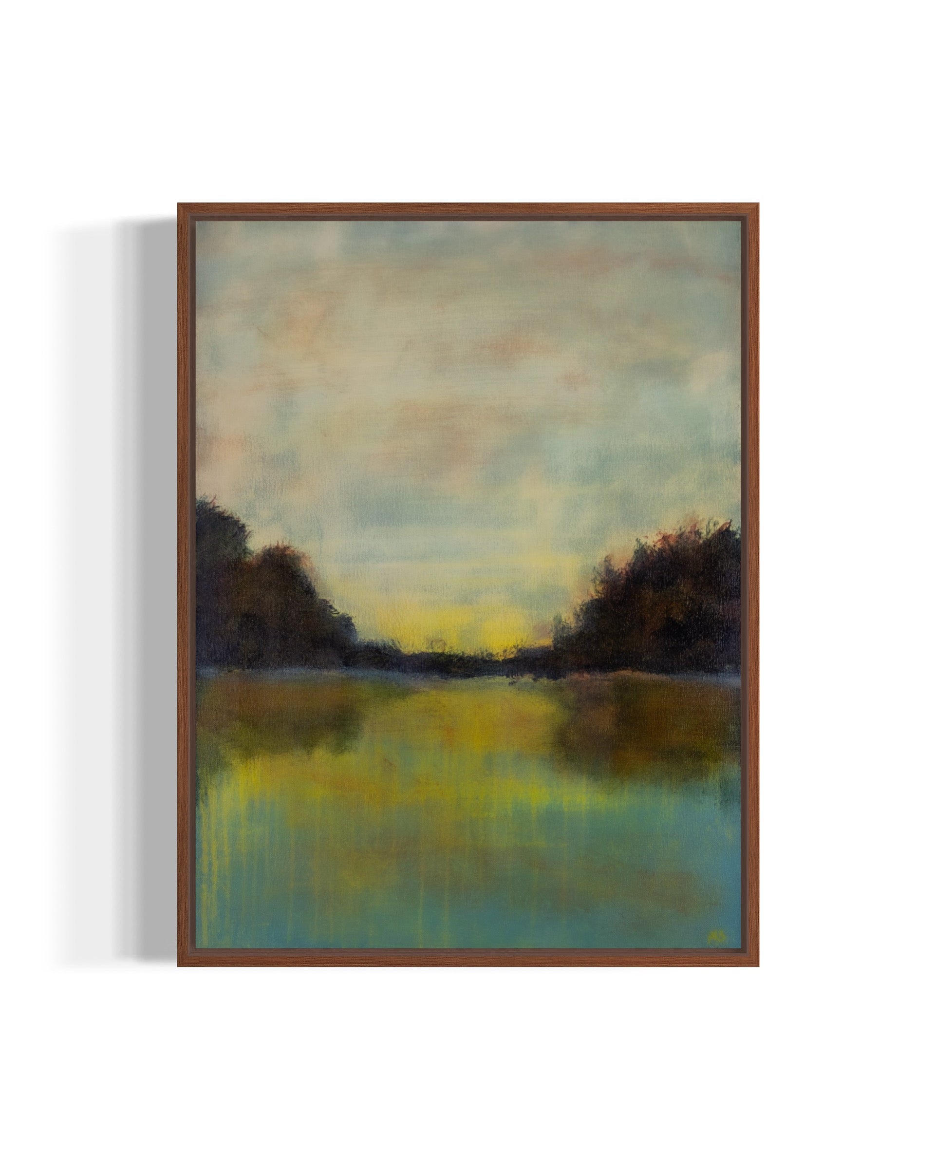 This work by Becca Splawn is 18 x 24 and is in a wood floater frame. Becca's work is crafted using acrylic and mixed media on canvas. Her works are inspired by the expansive landscapes of rural South Carolina and Northern Michigan, where she spent most of her childhood.