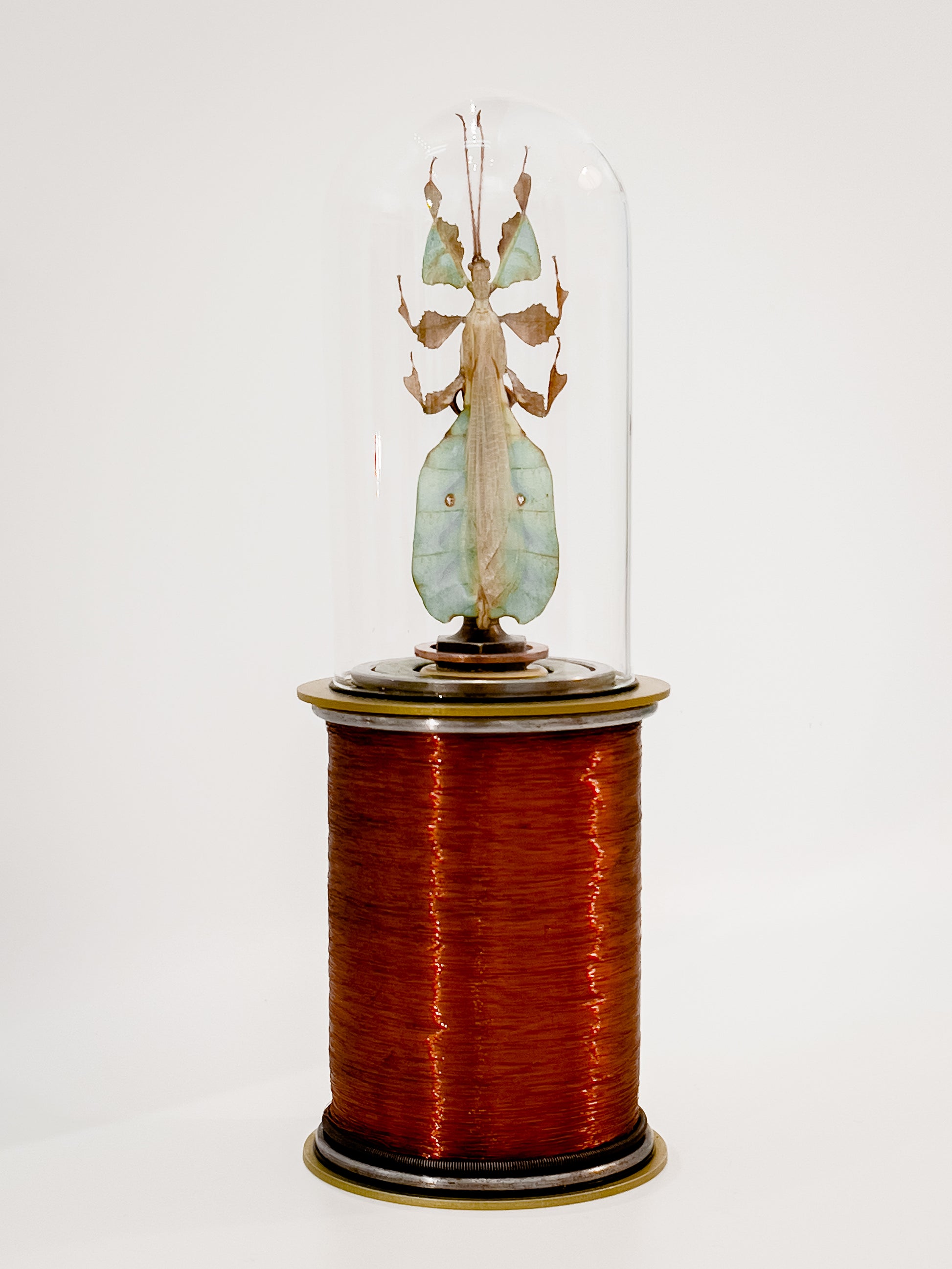 Suzanne Schmid’s pieces are preserved under a glass dome that she hand-blows in a hot glass studio. She uses a "cold connection" technique to build her pieces with nuts and bolts and machining parts. Her sculptures are modern-day reliquaries for the office and home.