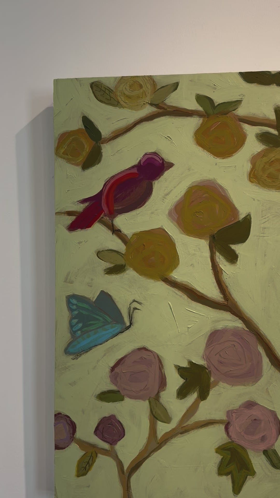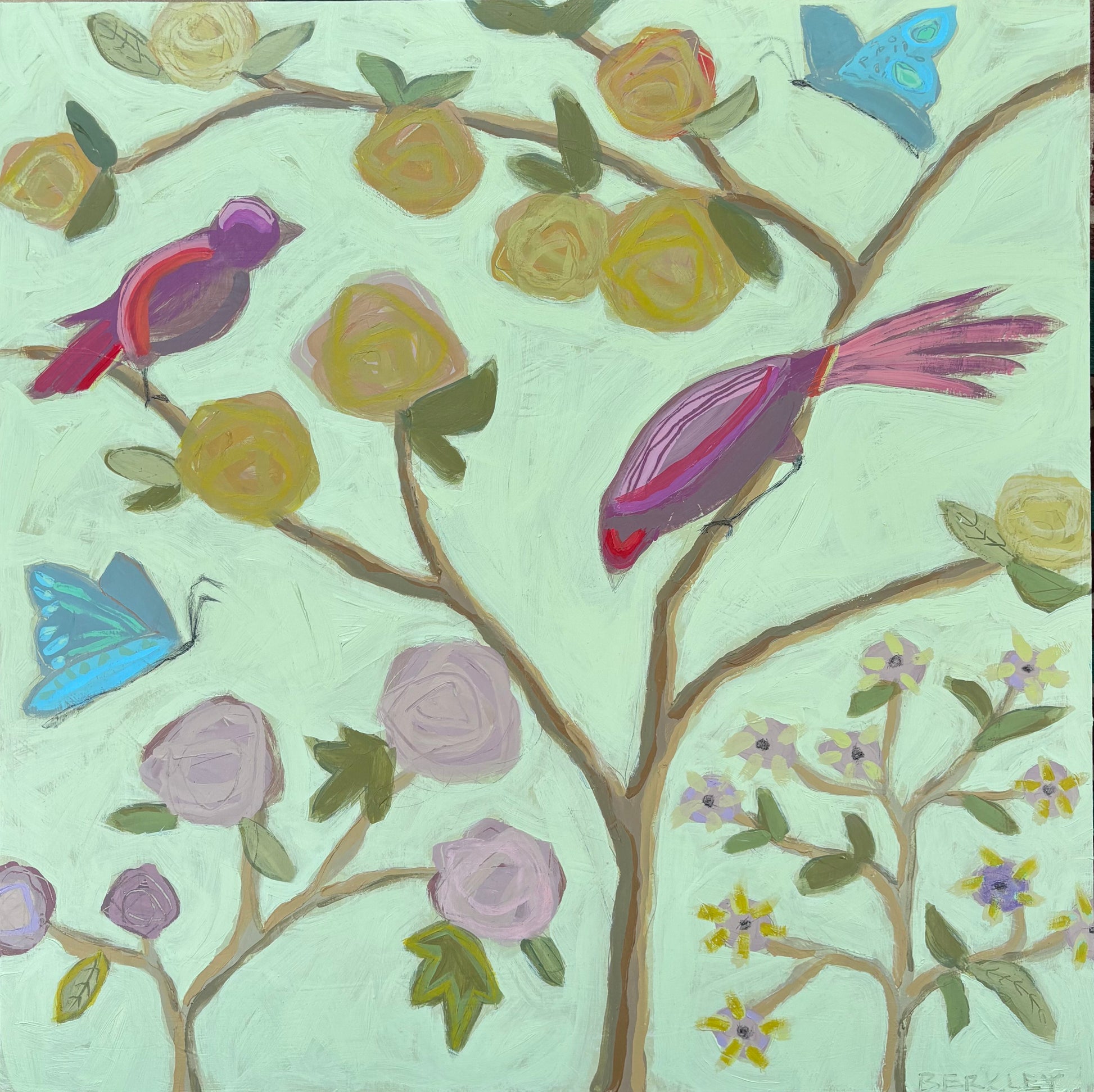 Berkley paints primarily with acrylic and ink. She paints the way she sees the world – full of joy, movement, and layers waiting to be discovered. She uses palette knives, brushes, tools, and fingers to scratch and manipulate the wood panels – because paintings are nothing if not alive.