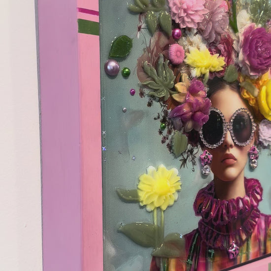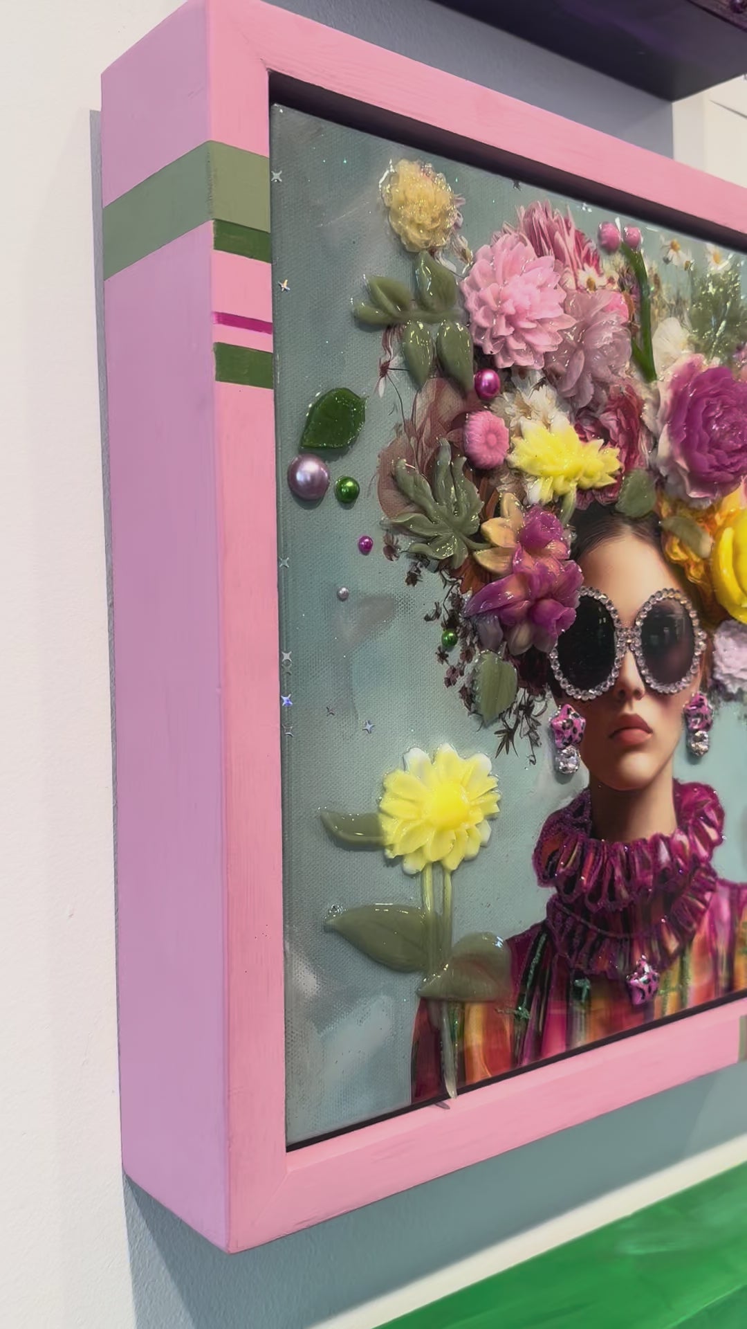 Amy Shekhter is a multi-disciplinary artist living in Florida. She spent the first 20 years of her life growing up in Alaska, which has many months of cold and darkness. This inspired her to use unconventional materials to create a space indoors filled with colorful art and interesting designs. After moving to Florida, she earned her Masters Degree in Art Education, and spent 8 years teaching public and private school students about art. Having missed the time to create her own work, she decided quit teaching to follow her passion and became a full-time artist. Guided by her fascination with different cultures, communities, and fashion, Shekhter merges digital design with various materials and textures. Layers of media, such as resin castings, plexiglass, beads and glass are carefully placed to give each artwork a three-dimensional appearance. Each figure is imagined from a distant memory or dream and inspired by the beauty of nature and growth, giving the viewer a sense of joy and wonder while also having them construct their own connection from the various visual elements.