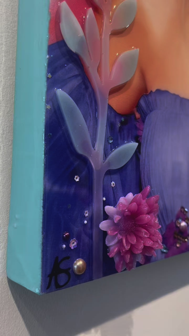 This artwork by Amy Shekhter measures 20 x 16. Amy merges digital design with layers of texture including: resin, glitter, paint, and crystals.