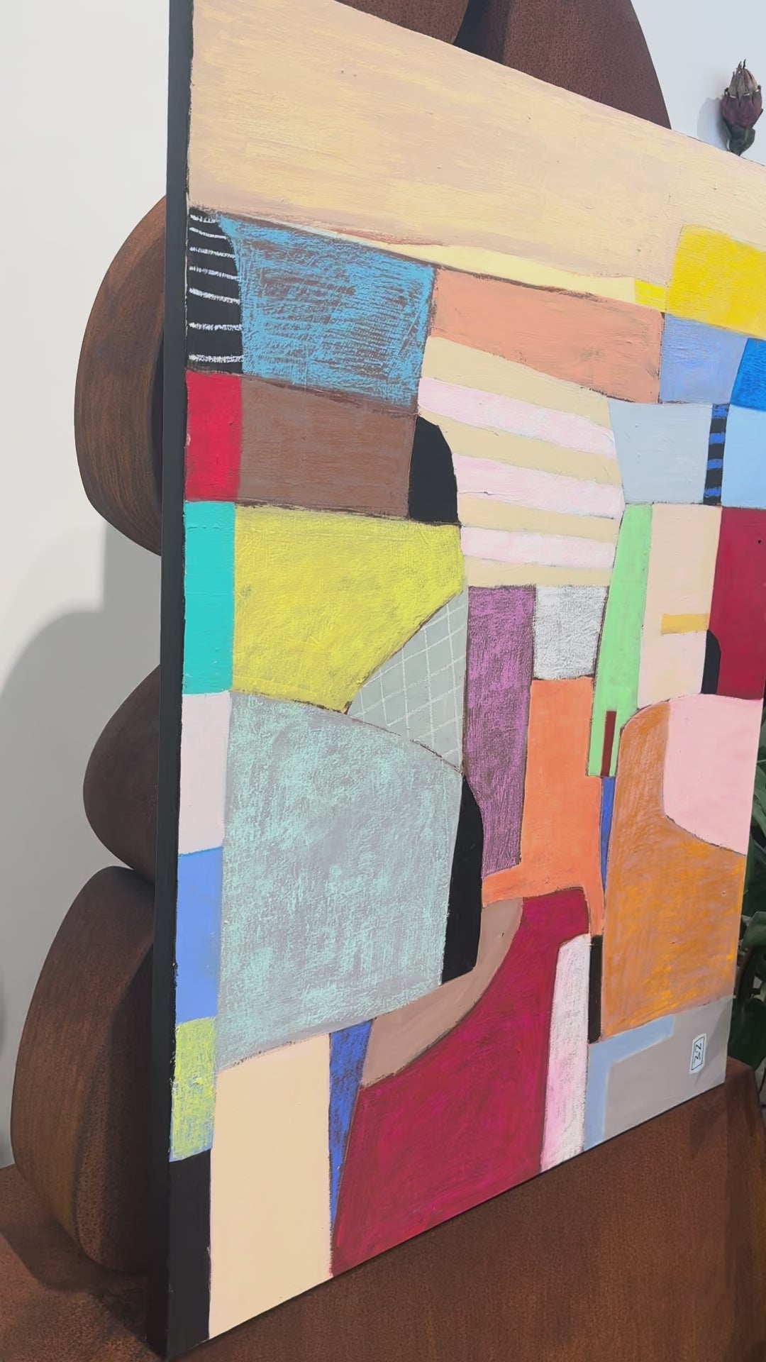 This piece by Nathaniel Mather measures 48"x 36". It incorporates stamps and paper which gives the painting a quality of age, travel and experience. The piece is made with water medium materials and is on canvas. This painting is part of the "Draw Near" collection.