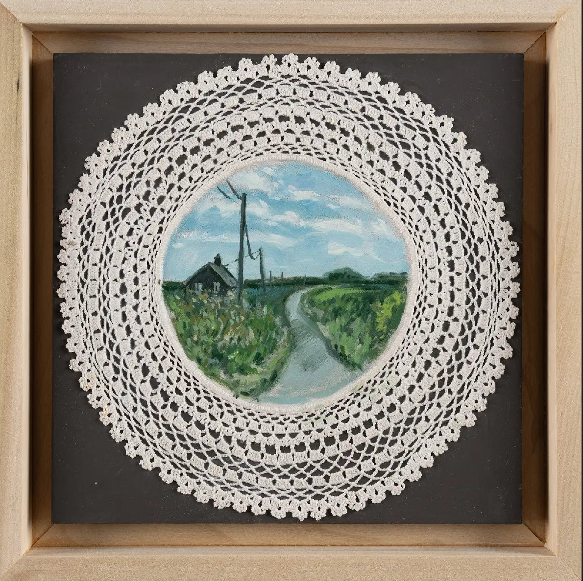 This Mixed Media Painting by Michelle Berg Radford is 9 x 9. This work is painted on a vintage doily.