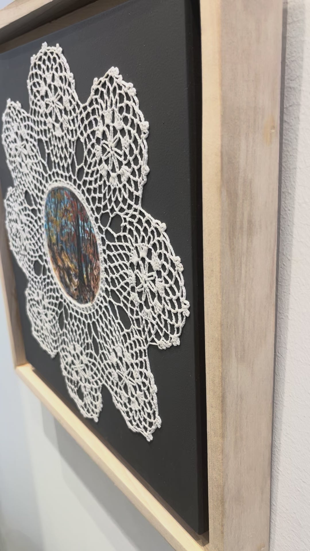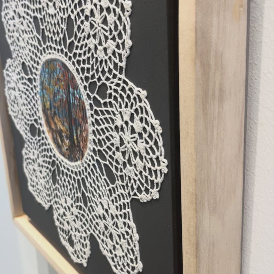 This Mixed Media Painting by Michelle Berg Radford is 12 x 12. This work is painted on a vintage doily.