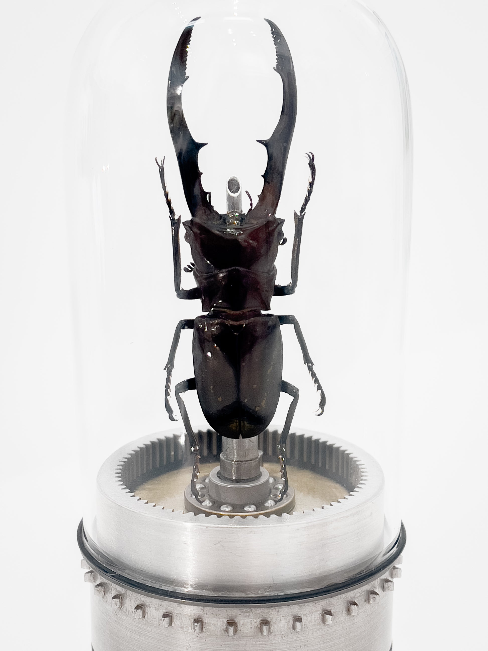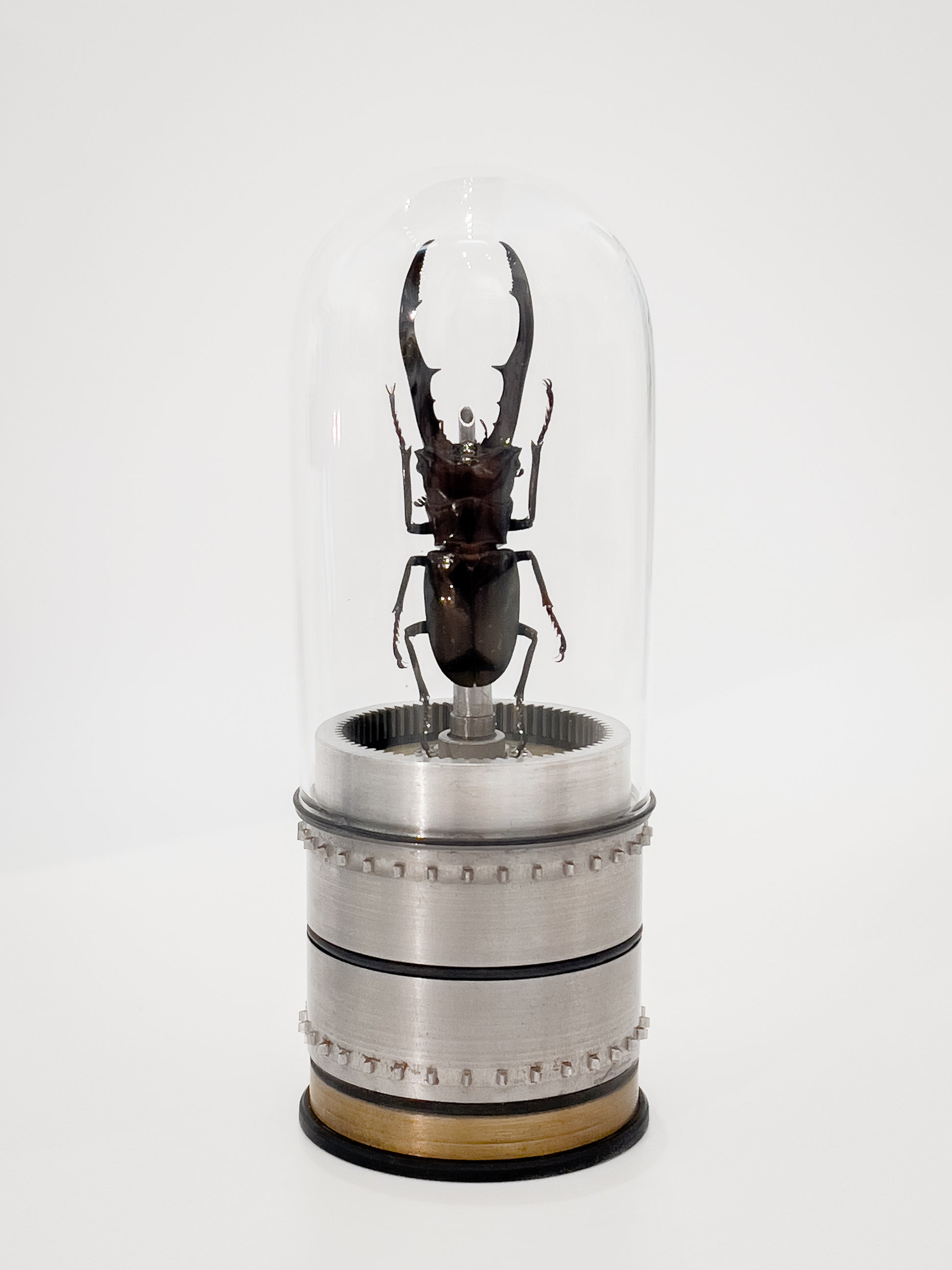 Suzanne Schmid’s pieces are preserved under a glass dome that she hand-blows in a hot glass studio. She uses a "cold connection" technique to build her pieces with nuts and bolts and machining parts. Her sculptures are modern-day reliquaries for the office and home.