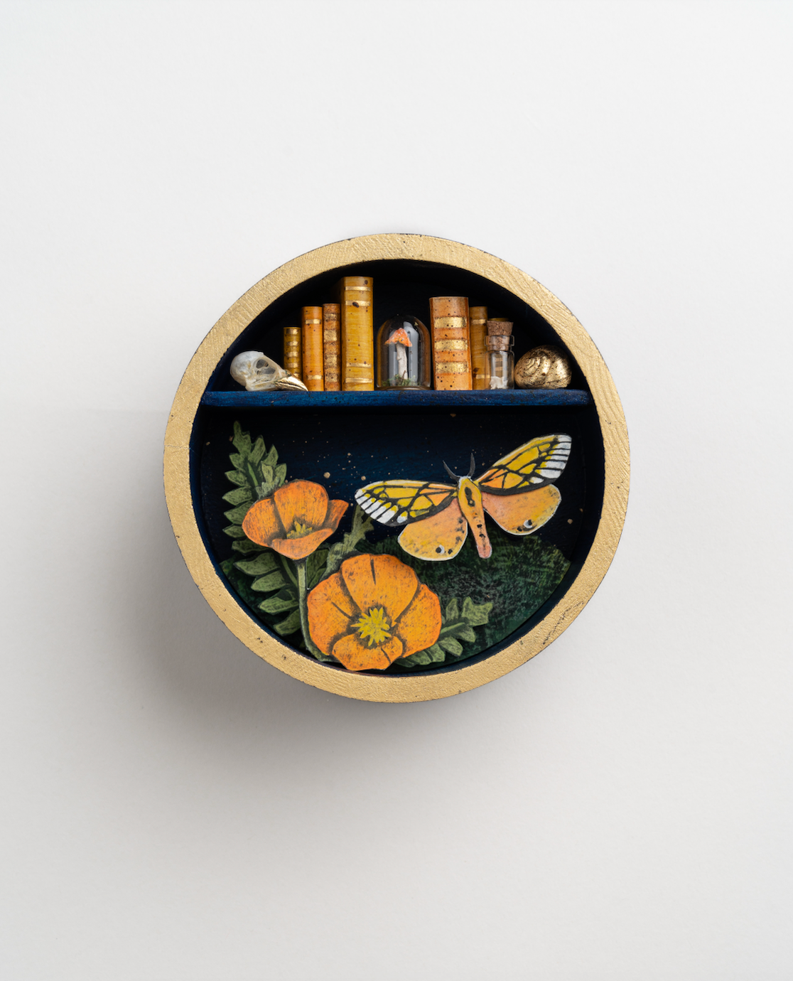 "My work is an exploration of the natural world. I use scraps of wood, paper, bone, and fabric and include both found and crafted specimens. Each art piece contains a variety of processes including collagraph printmaking, woodworking, and sculpting. There is a certain practicality and reflection to my work. I work with things that have died, but left a beautiful reminder of their existence (skulls, vertebrae, fossils, and insects). I am inspired by the sense of discovery of 18th and19th century natural history collections, and the preservation of reliquaries housed in the great cathedrals. As they do, my art invites a closer study of the earth around us." Bess