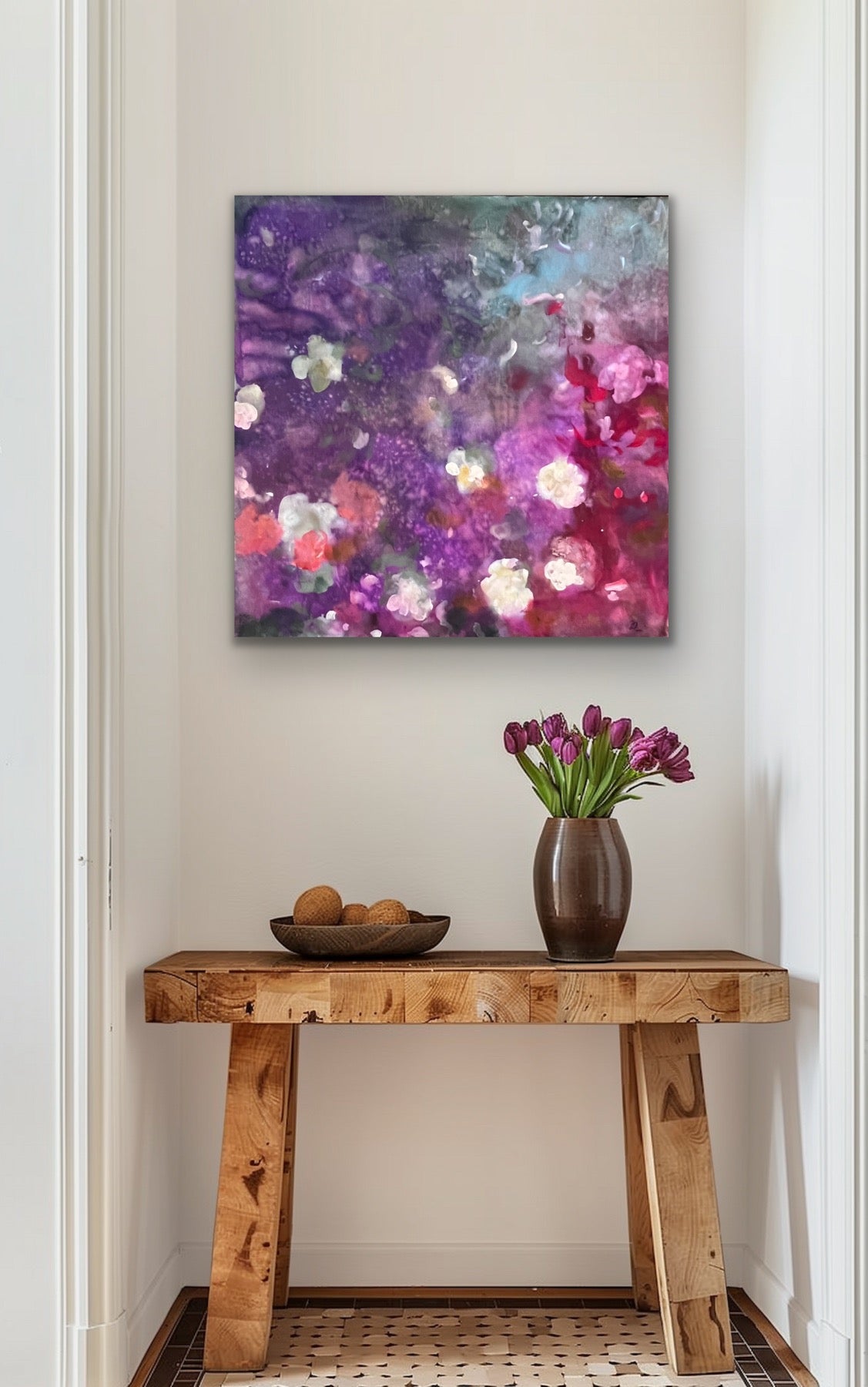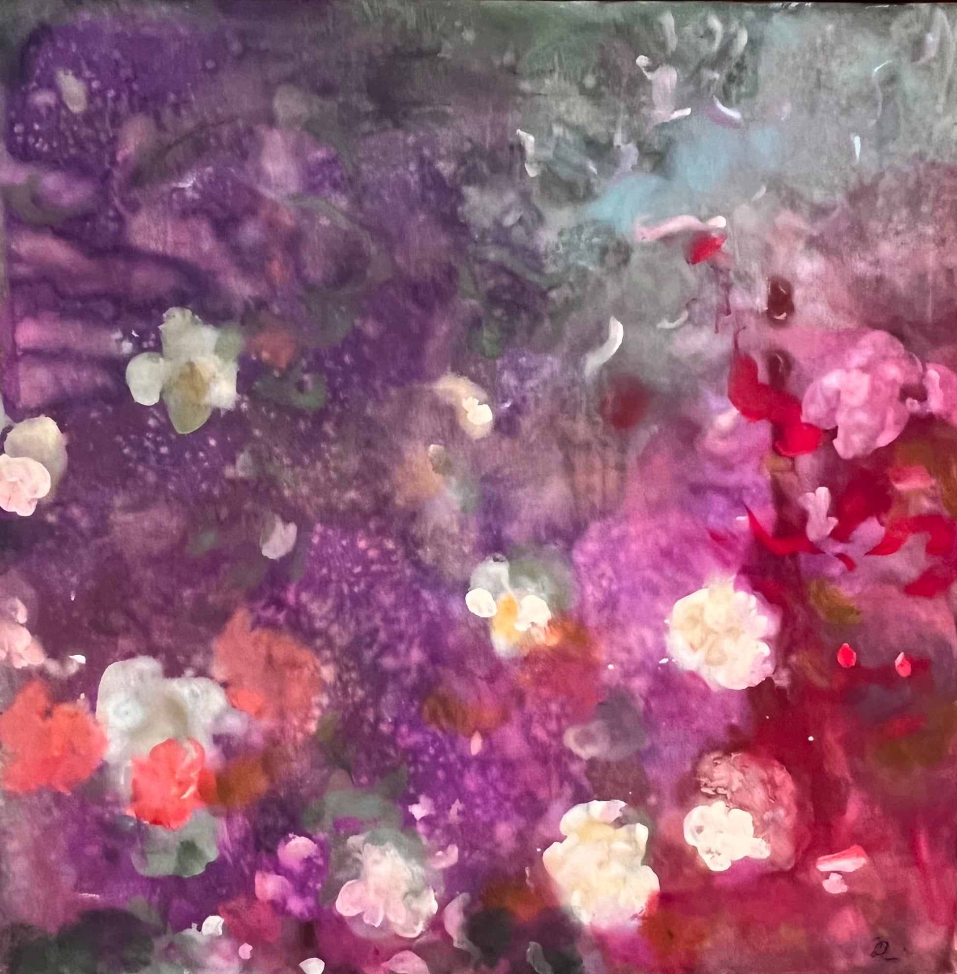 This Oil Painting by Amelia G. DeHart measures 36"x 36". Ameila seeks to express the divine through plant form, she creates complex yet soothing abstracts using vivid pigments and fluid like shapes.