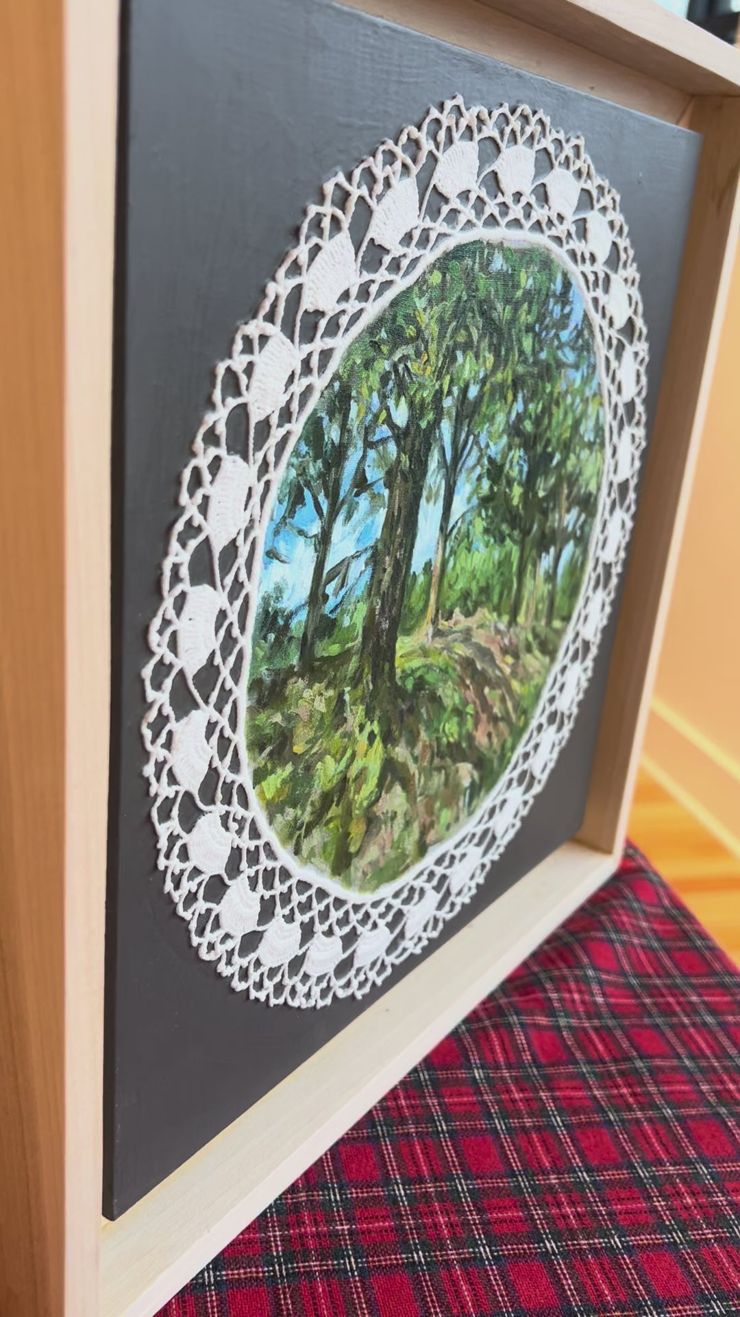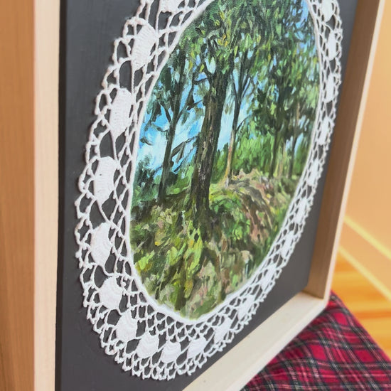 This Mixed Media Painting by Michelle Berg Radford is 14 x 14. This landscape is based on scenery from her travels. This work is painted on a vintage doily.